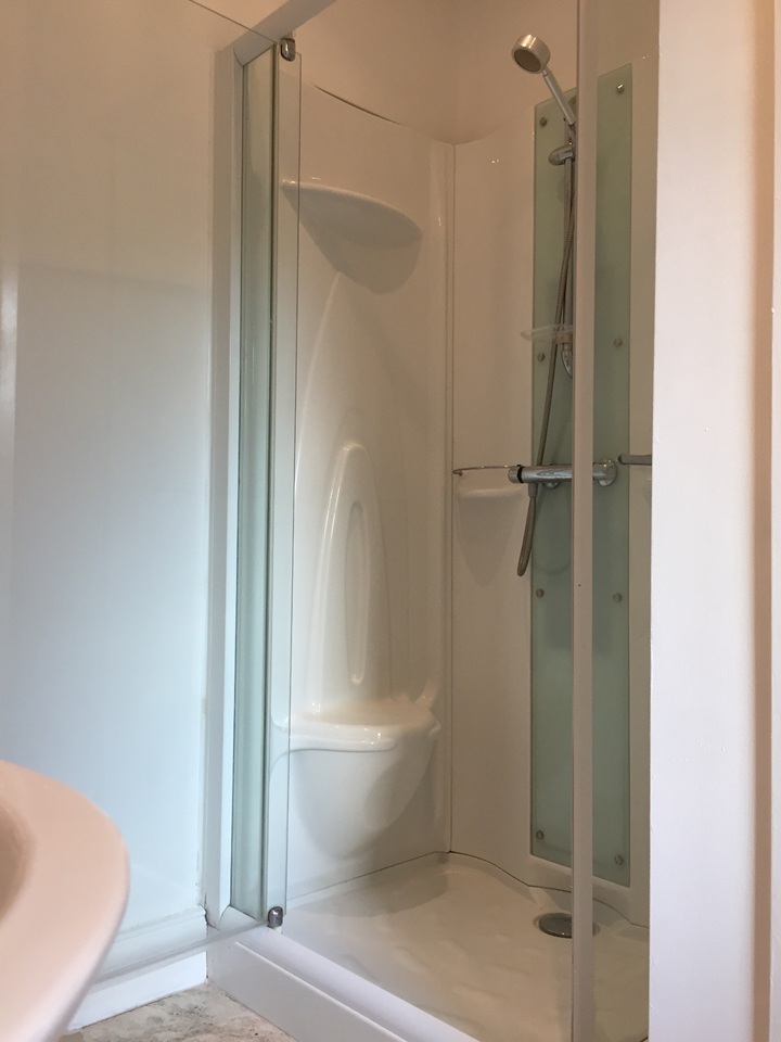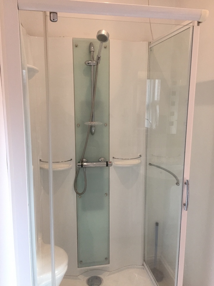 - Modern, clean bathroom with large shower