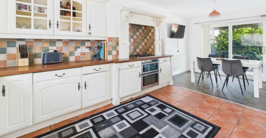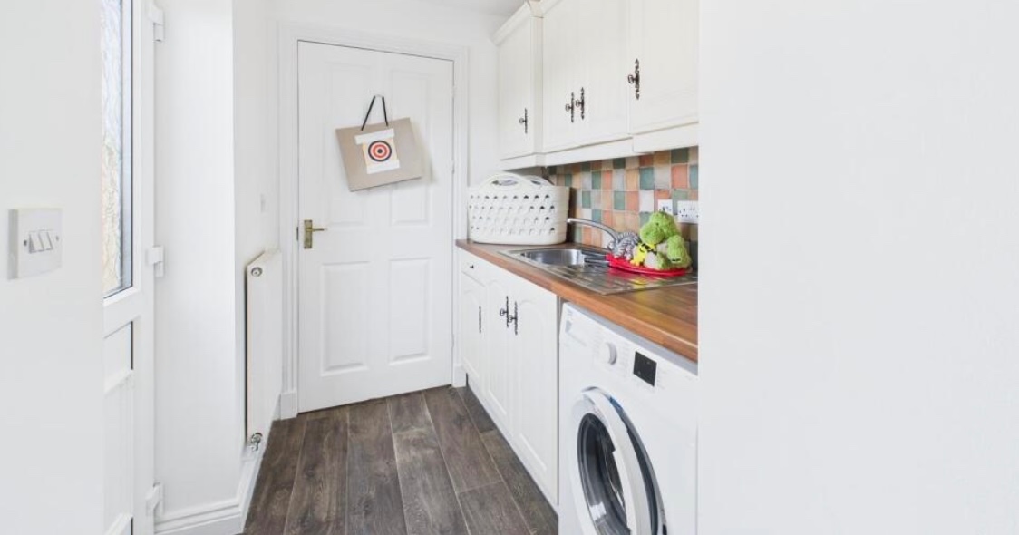 Utility Room – Storage cupboard, plumbing for a washing machine, radiator, and door to the garden. Access to the cloakroom.