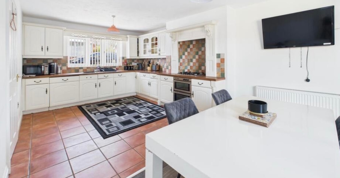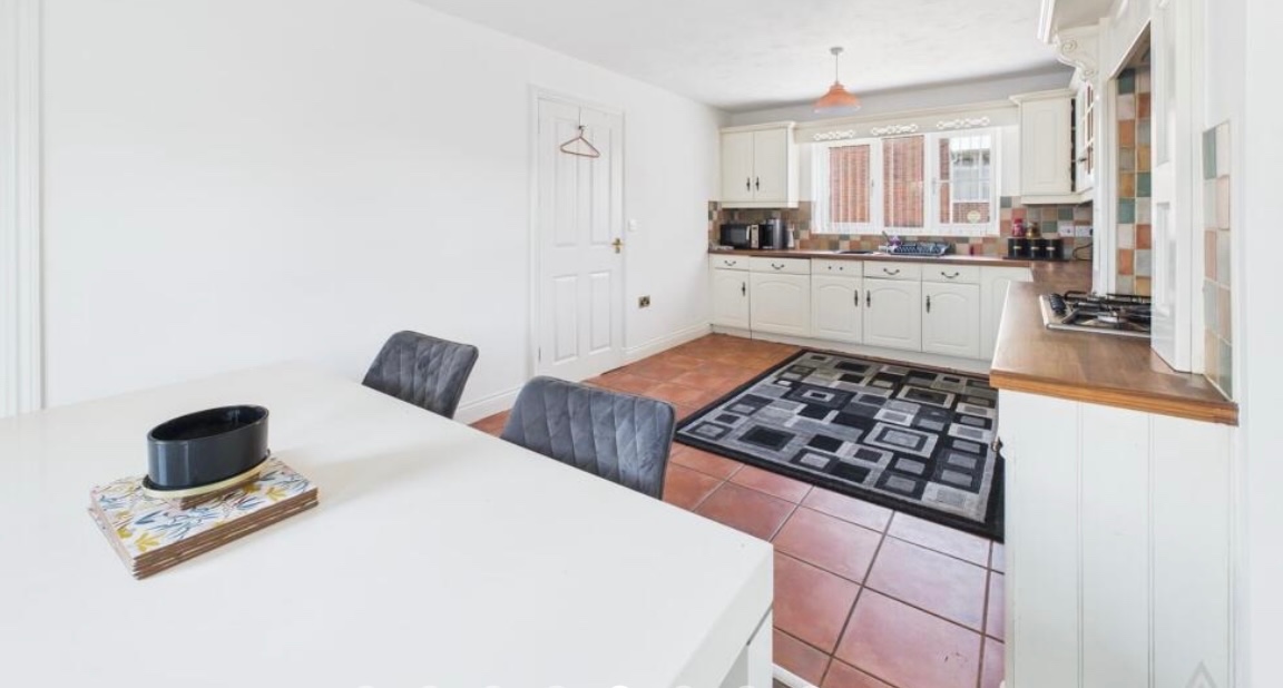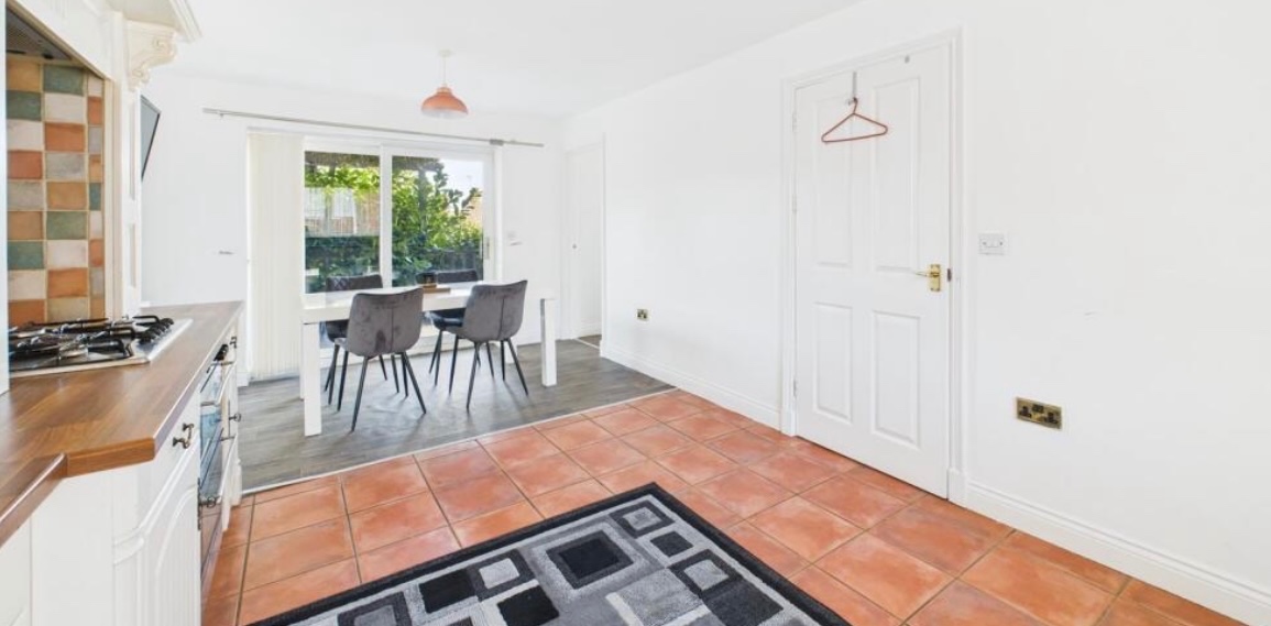 Kitchen/Diner – Modern wall and base units with worktops and sink/drainer. Integrated dishwasher, fridge, oven and hob. Radiator, front-facing UPVC window, and patio doors to the rear garden. Door leading to the utility.