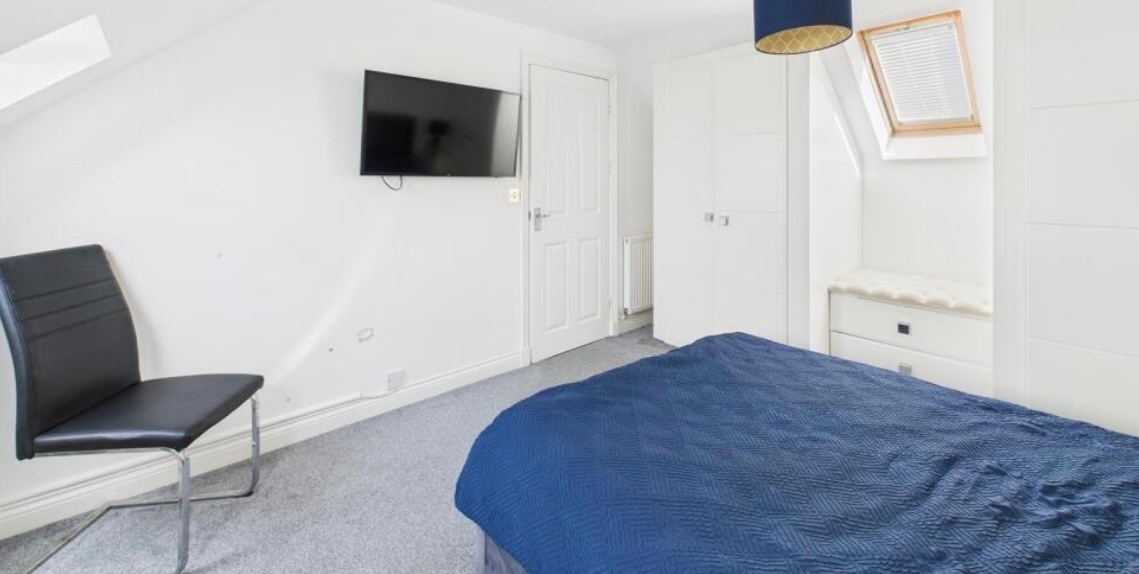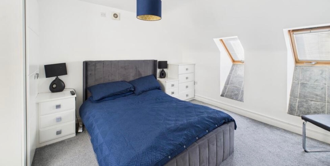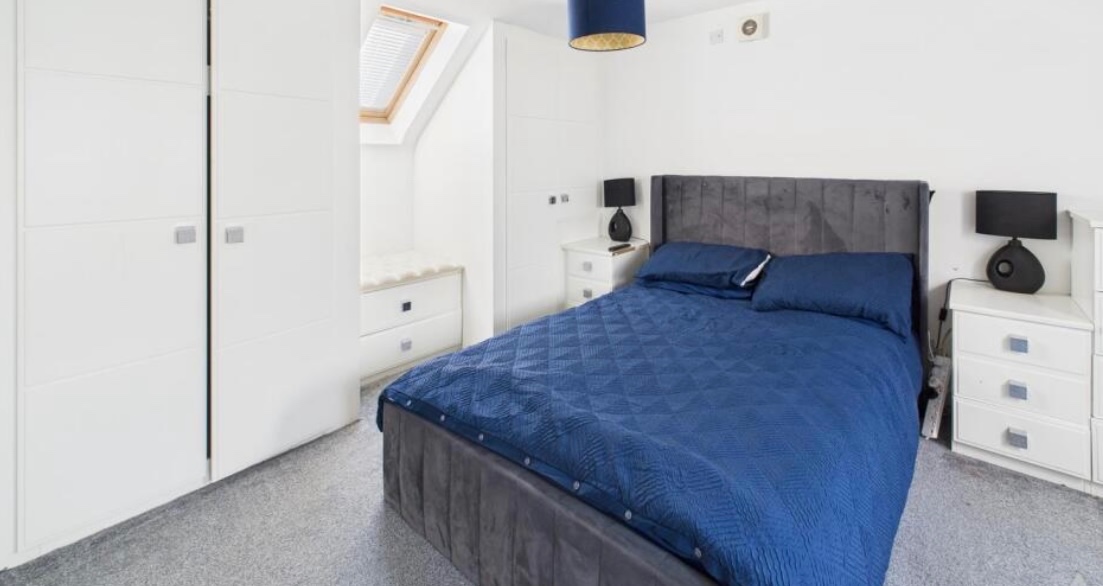 Bedroom – Large double bedroom with two skylight windows, fitted wardrobes, and radiator.