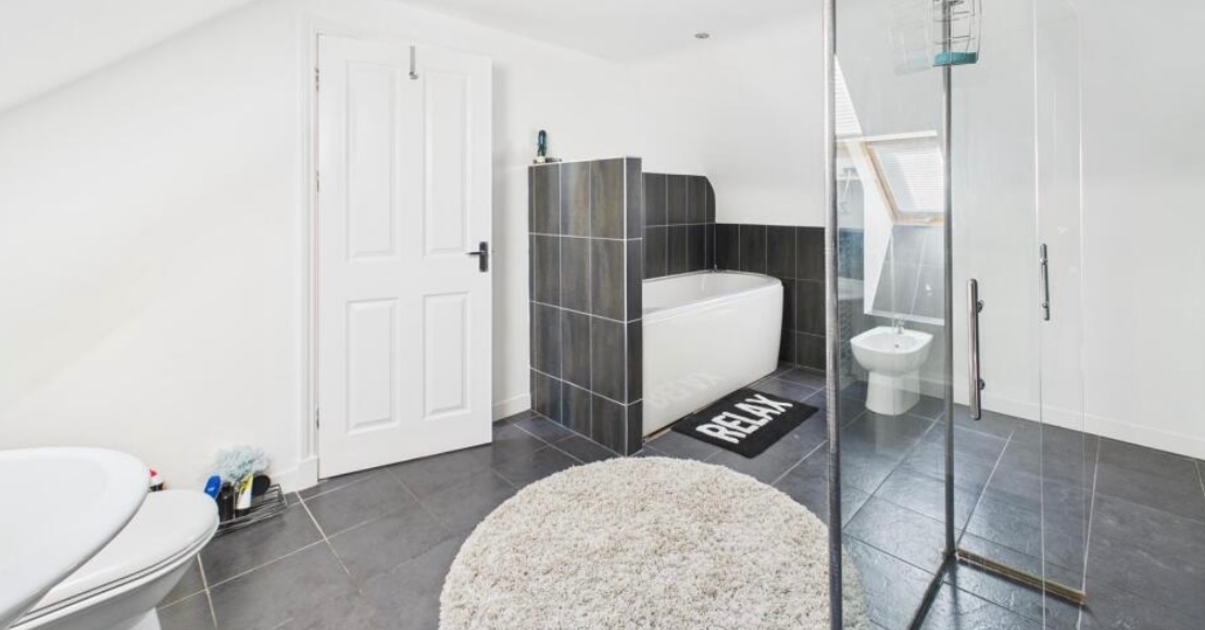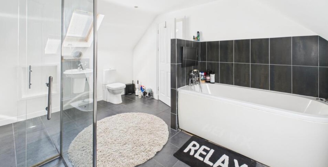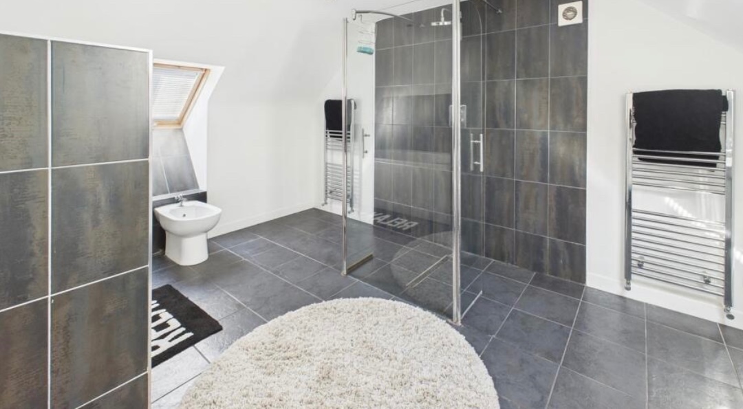 The top floor features a large double bedroom and a stunning bathroom complete with a walk-in shower, full-size bath, and a fitted TV.
