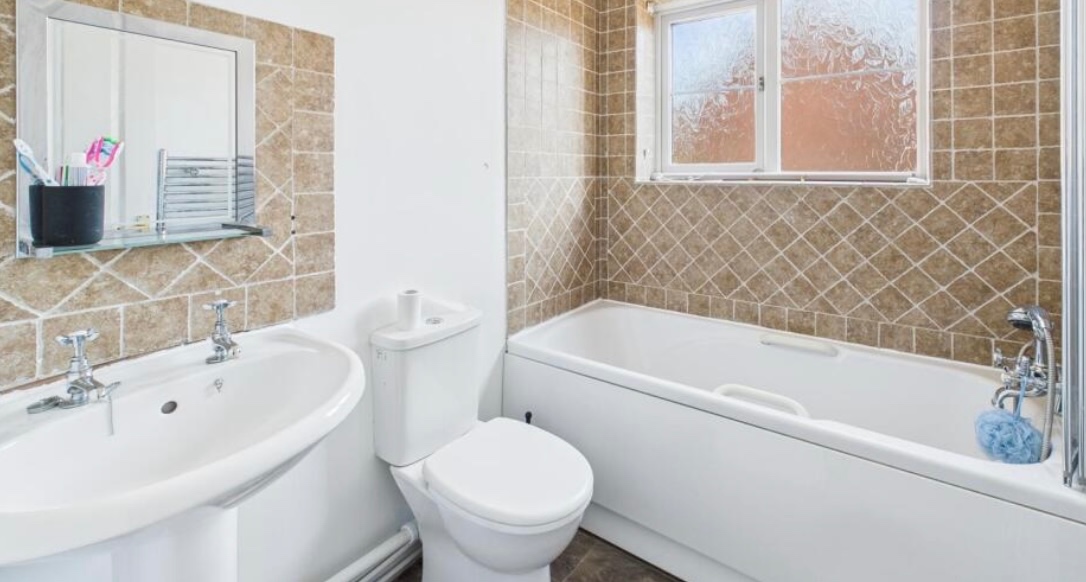 Bathroom – Suite includes a panelled bath, low-flush WC, wash basin, radiator, and UPVC window.