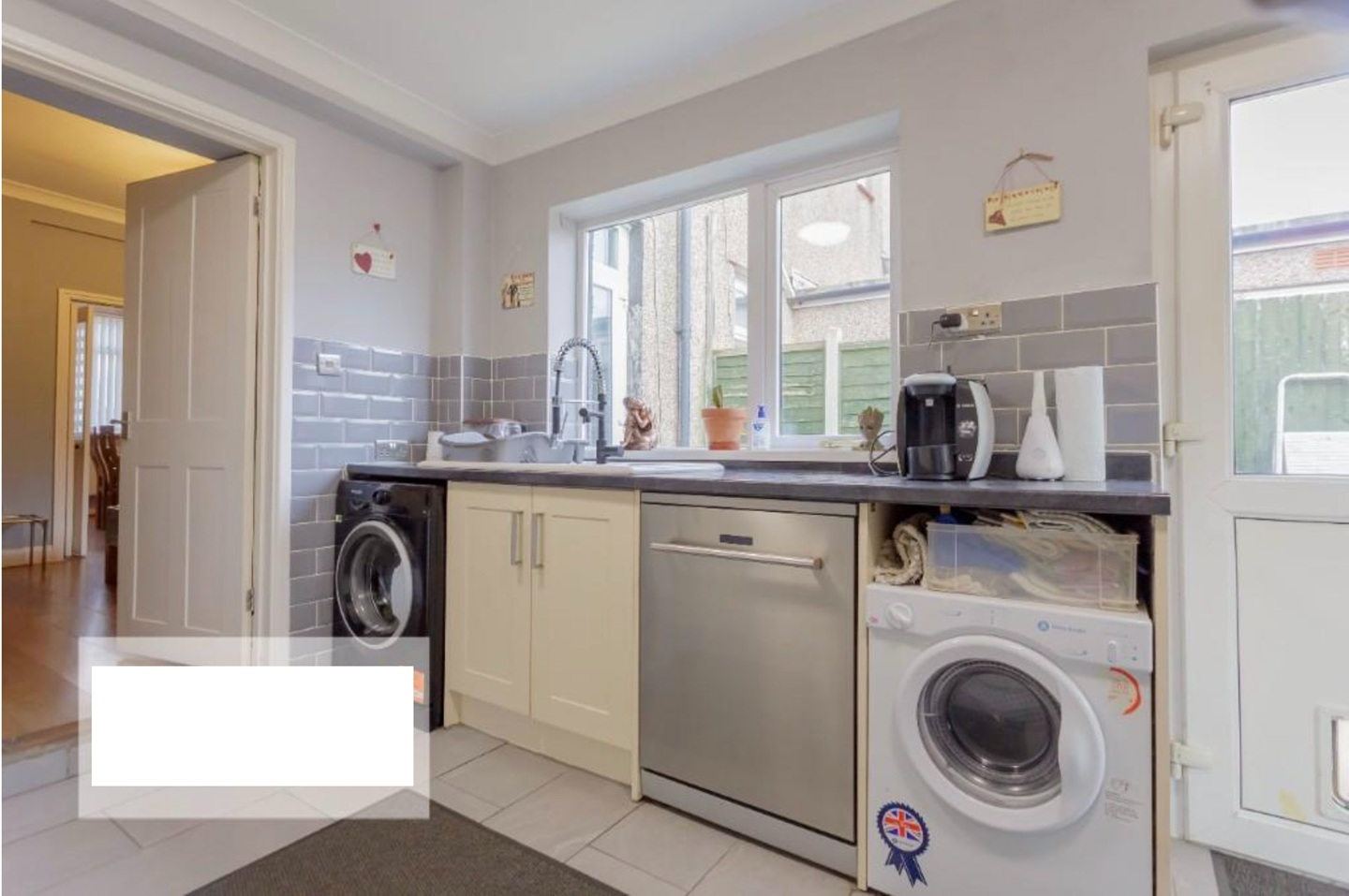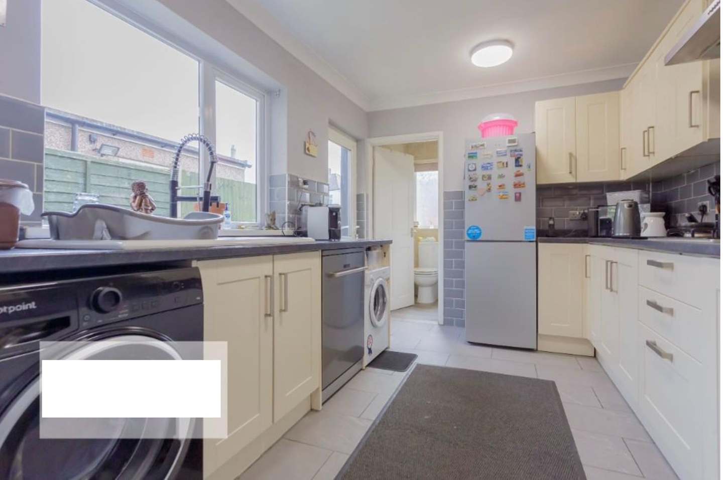 Modern kitchen opening onto the garden. Washing machine, dishwasher, hob/oven and fridge freezer.