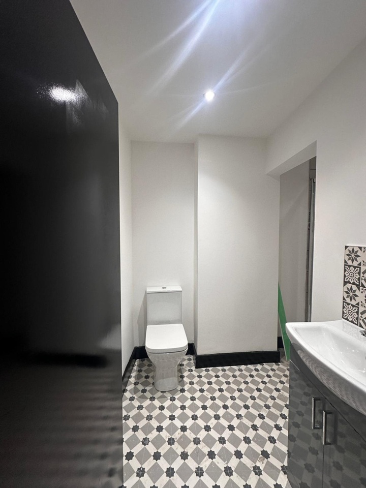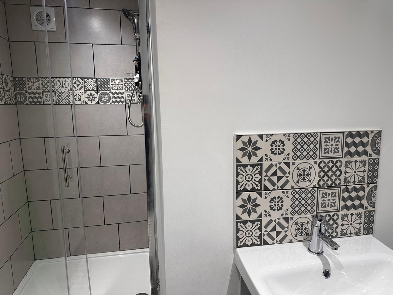 Fully tiled and fitted with a sleek three-piece suite including a powerful shower, basin, and WC. -
