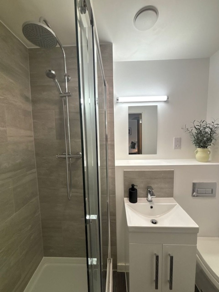 🛀 There are large en-suite shower rooms to both bedrooms, one with a double shower cubicle and the other with a shower over the bath.