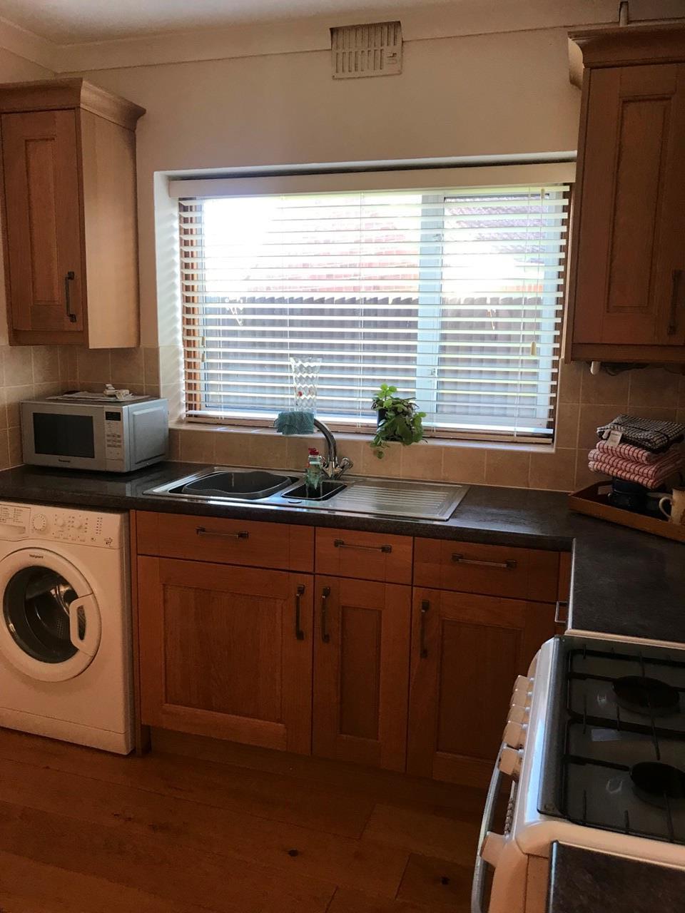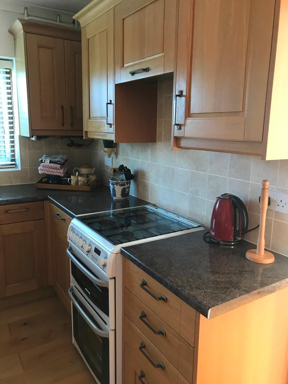 The kitchen has been fitted out in oak kitchen units and offers a free standing cooker, new washing machine, new Fridge/Freezer and free standing microwave. There is ample storage and there is another built in storage cupboard with meters. Kitchen table and chairs available if required.