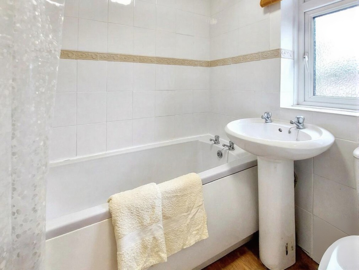 With three piece suite, with Linoleum flooring with shower, tiled, radiator and double glazed window with blind.