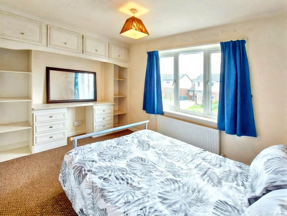 Generous sized bedroom with fitted wardrobe radiator, double glazed window with fitted curtains and carpet flooring.