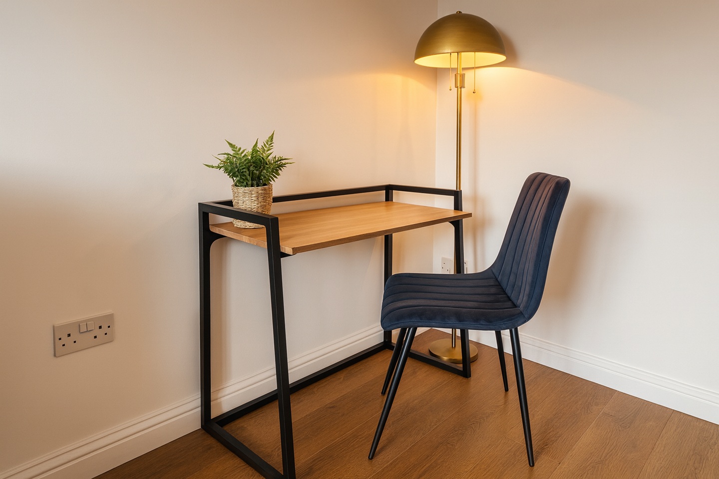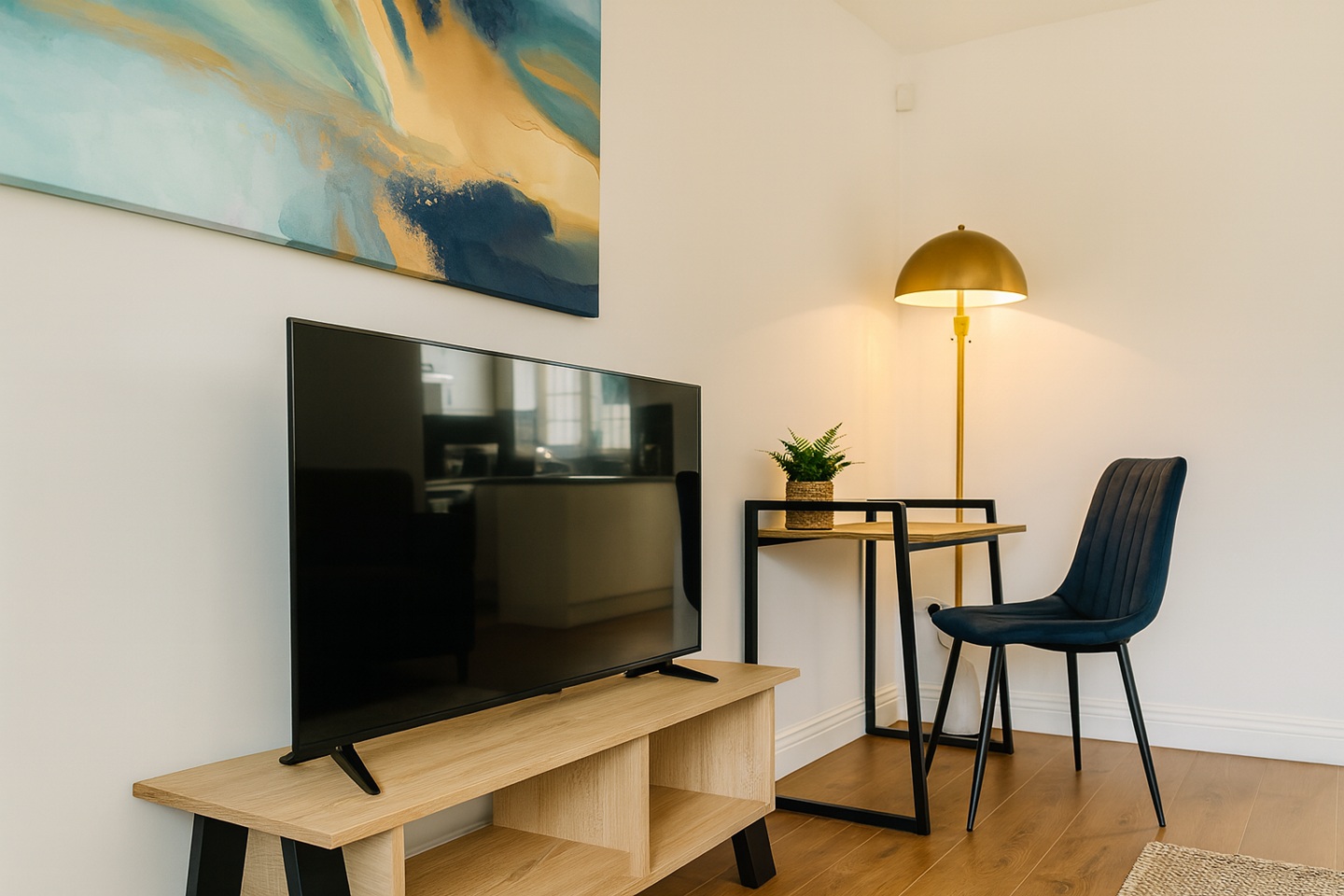 ☞ Living room: Sofa, Smart TV, desk & chair (perfect for remote work)