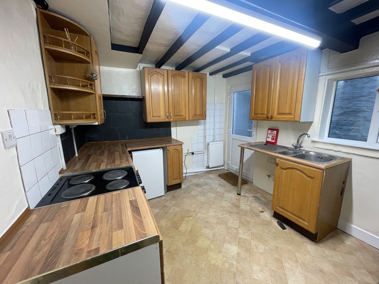 Kitchen includes electric cooker and fridge. Also plumbing for washing machine.