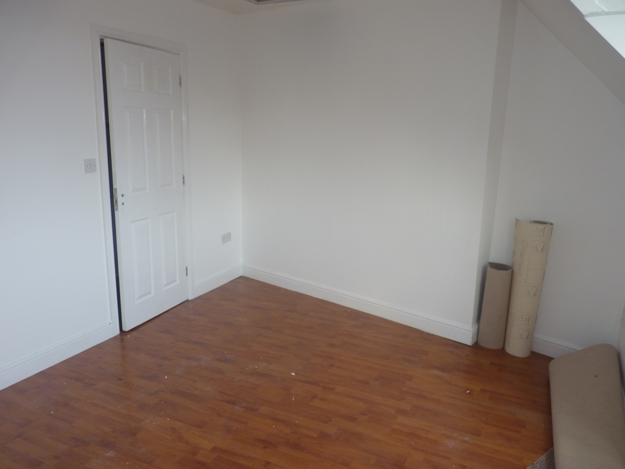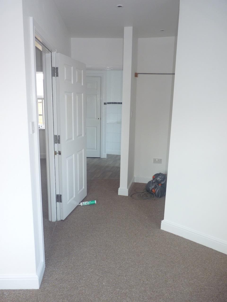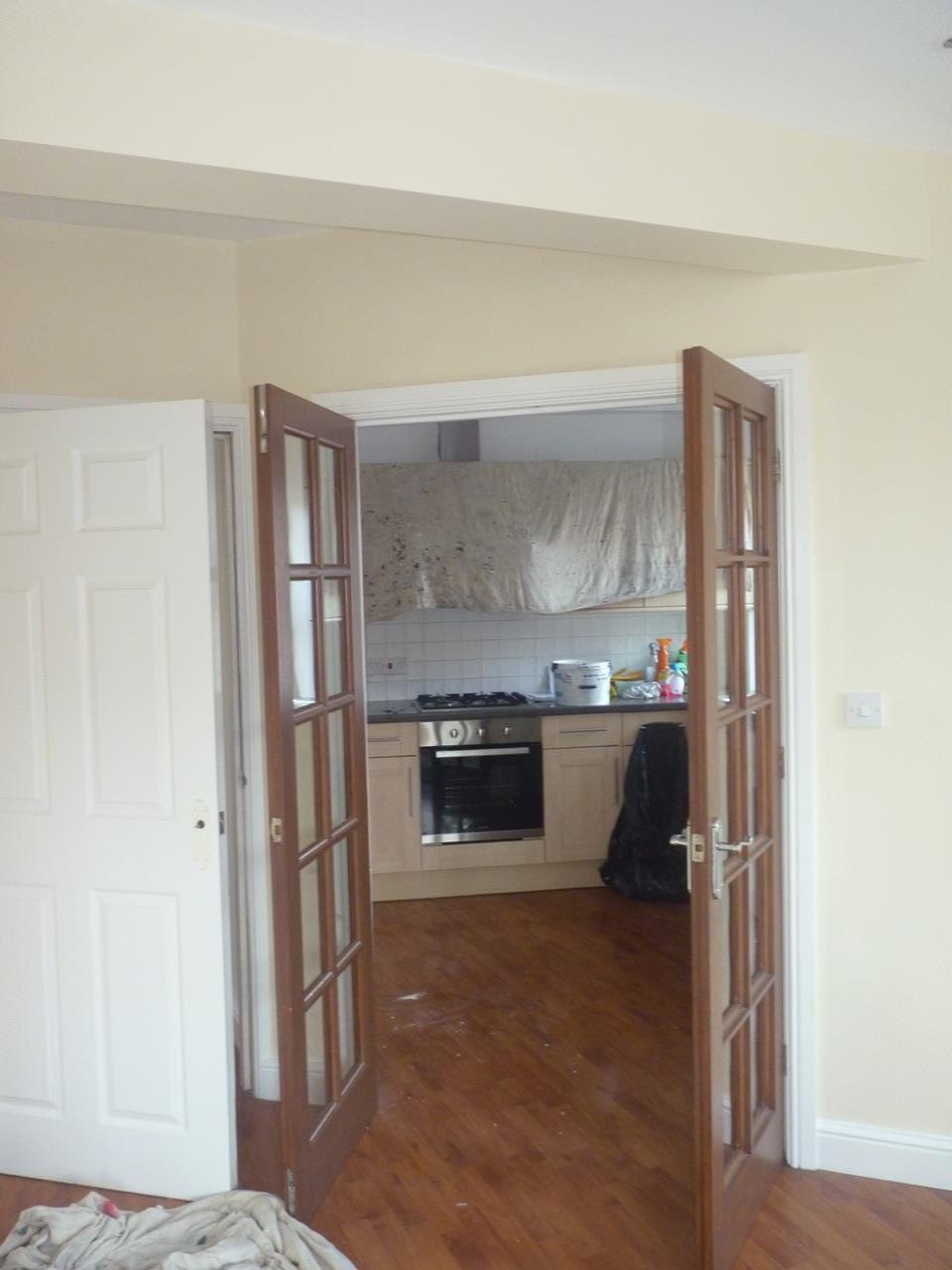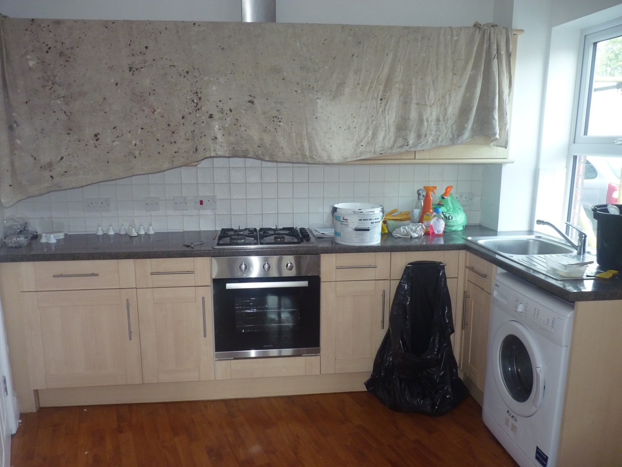 Ground floor - Front door into living room (4m x 3.5m) with large understairs cupboard, glazed partition doors into fitted kitchen (3m x 3,25 m) with integral cooker and fridge. Rear door from stairwell into communal yard / alley.