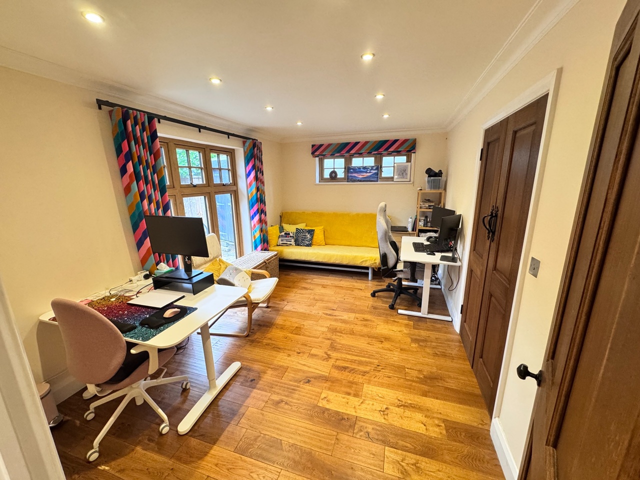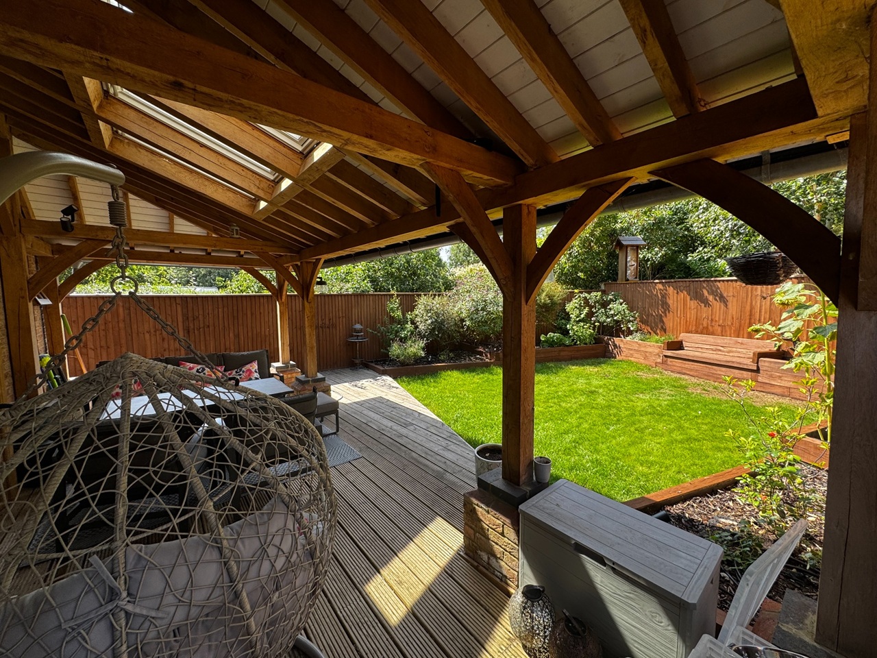 The house comes with ample storage and can be rented furnished or unfurnished. Outside, you’ll find a large driveway with parking for up to six cars, a mature secluded garden, and a stunning oak-covered patio with smart lighting, ideal for year-round outdoor living.
