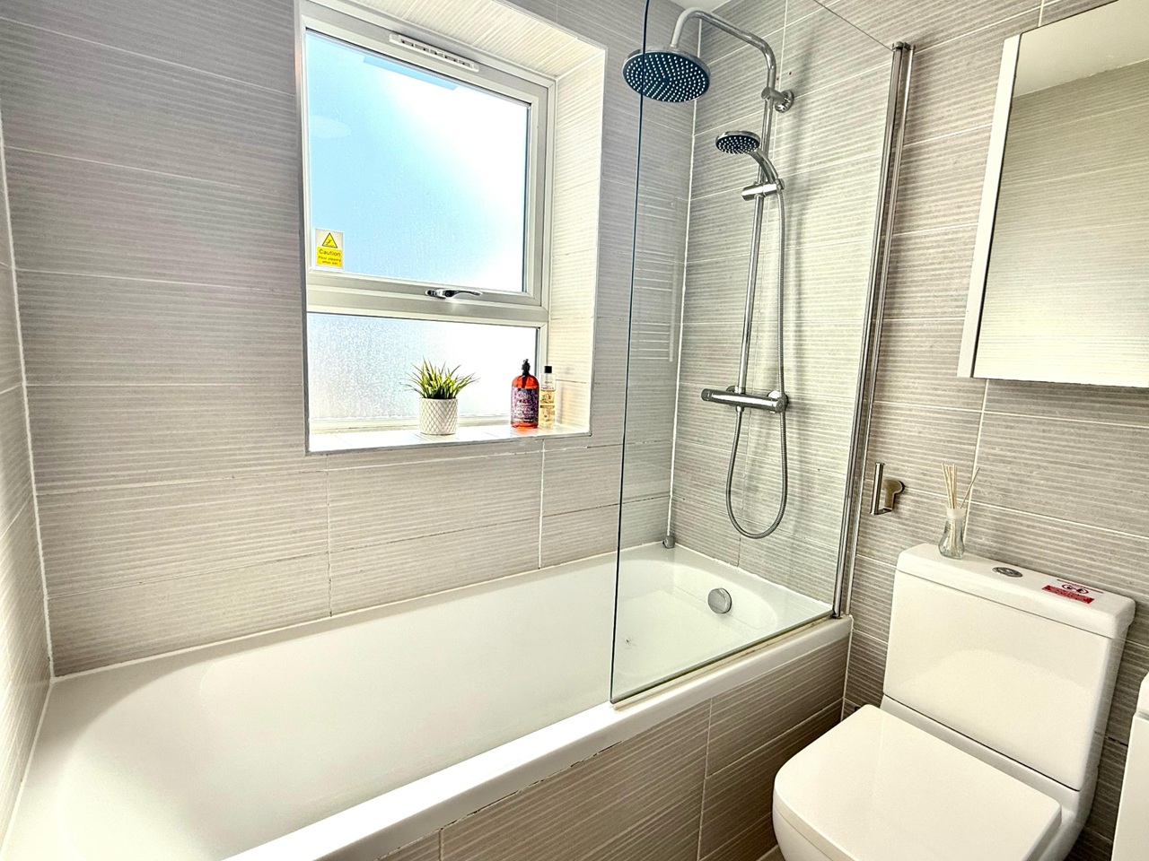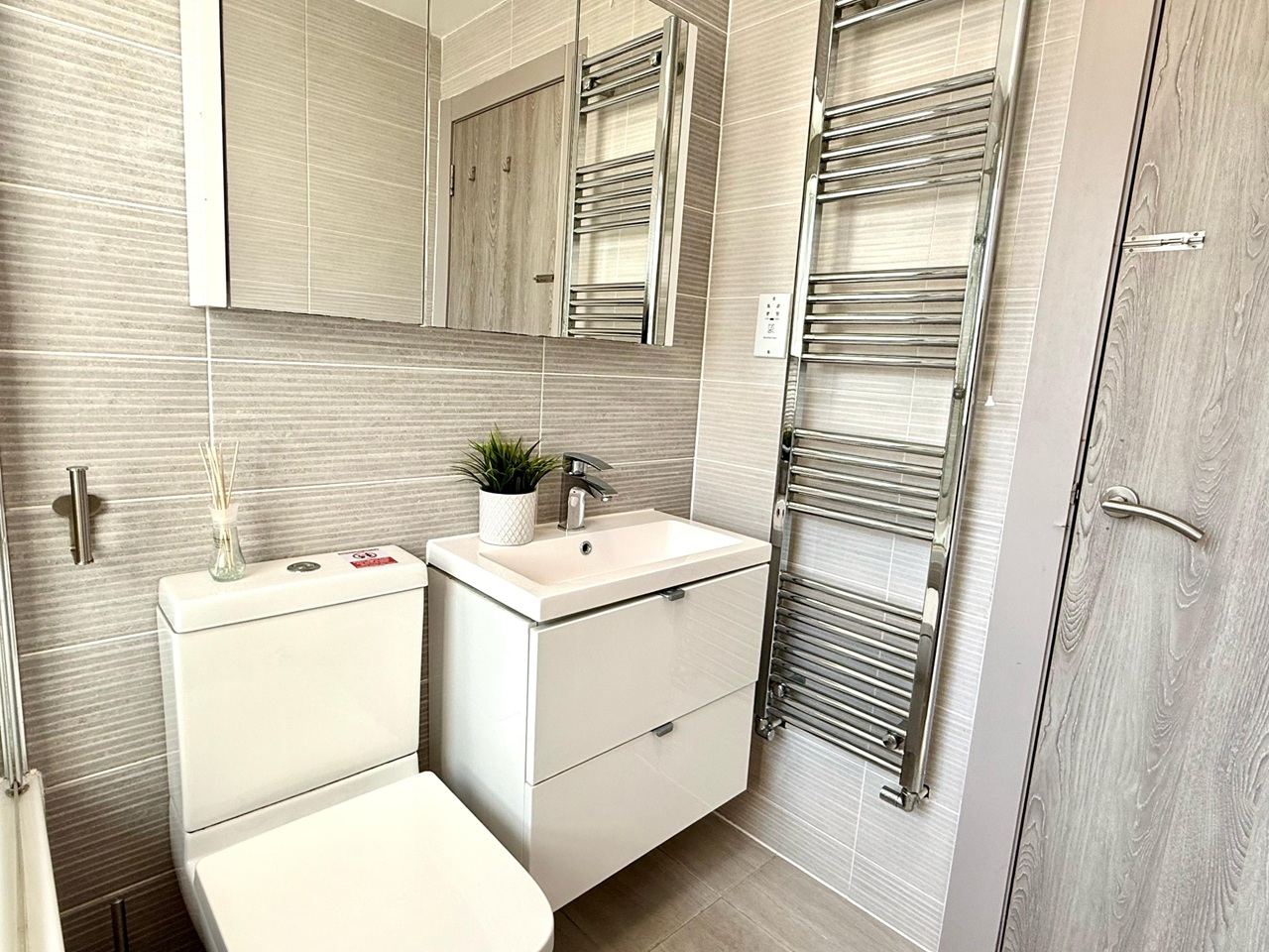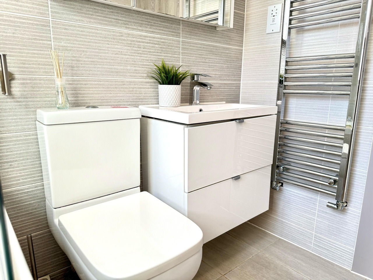 - 1 Bathroom with bathtub, toilet and hand wash basin