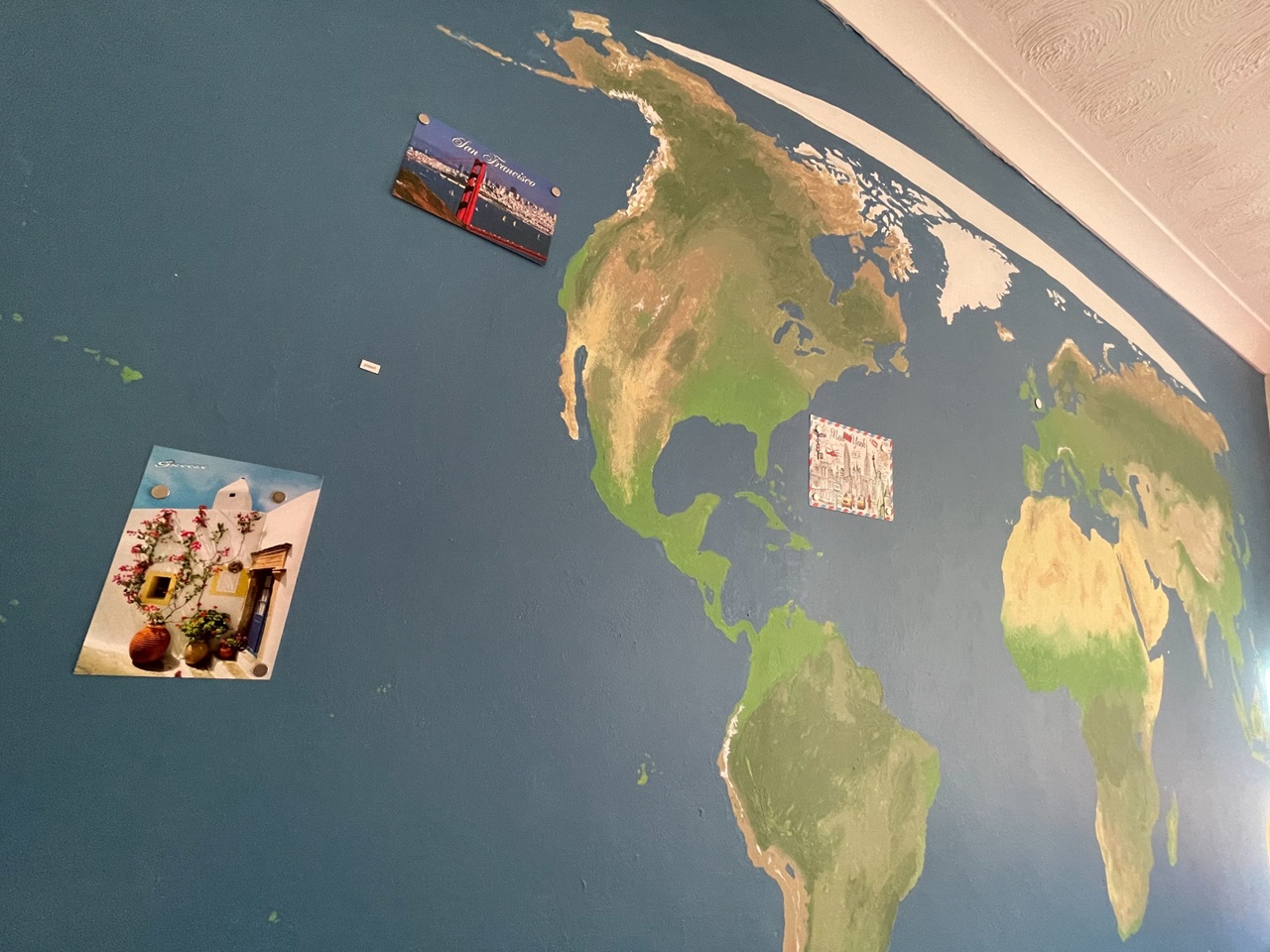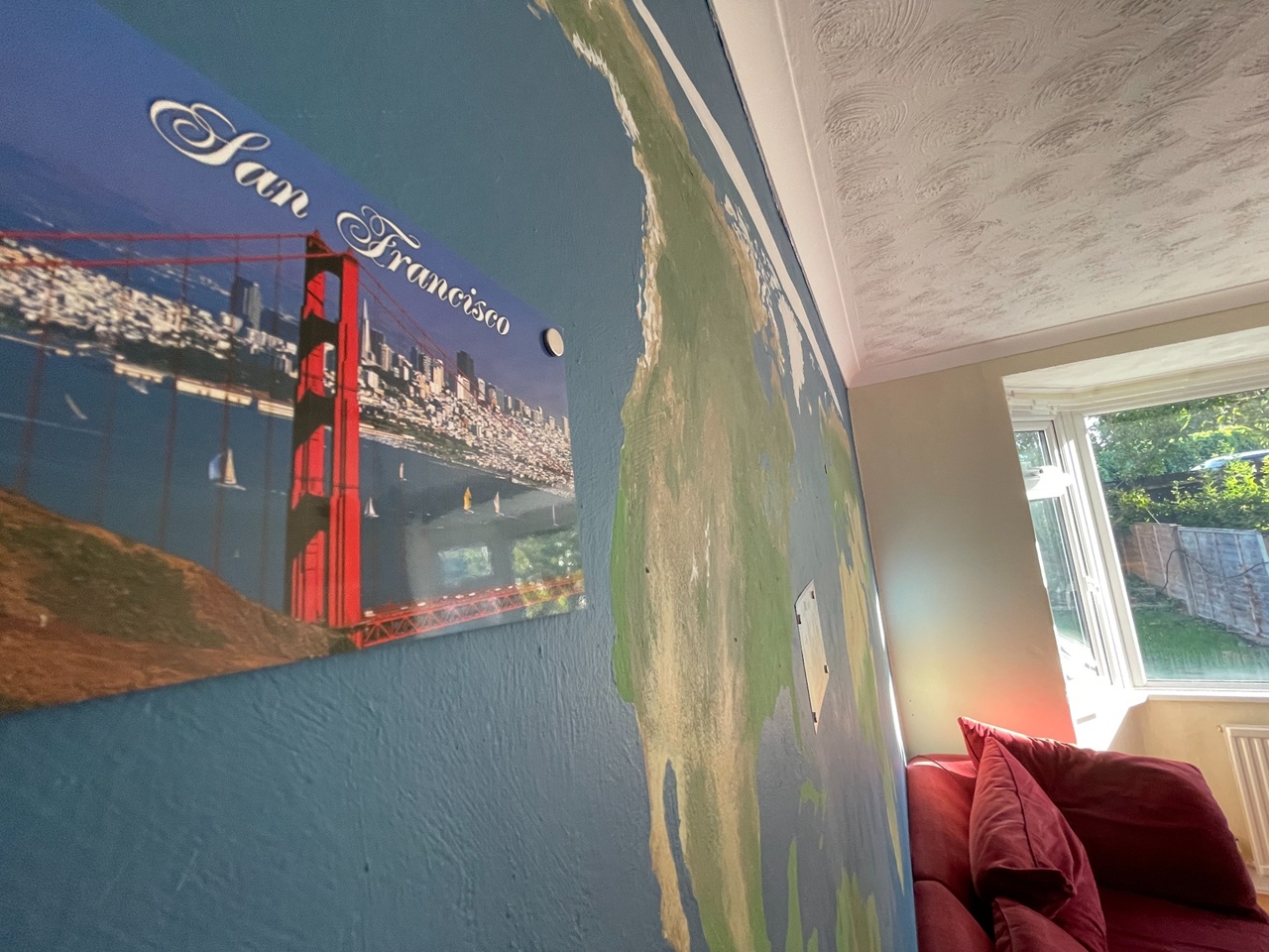 The room also features a beautiful mural of a painted world map with a special undercoat to allow magnets to be attached. We used it for displaying postcards, drawings, and to mark places we travelled and friends lived, but if it is not to your taste I will have it covered over.