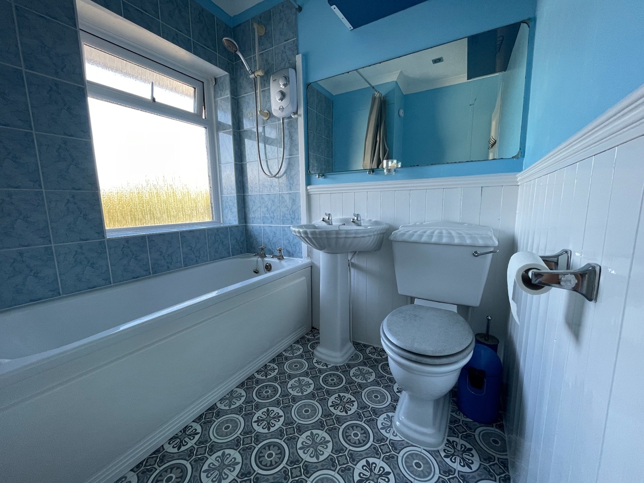 The bathroom has been redecorated in a modern style. There is a bath with an electric shower over it, a toilet, hand basin and storage shelves.