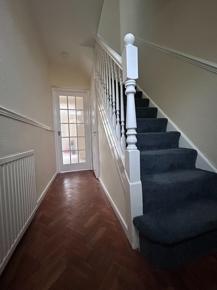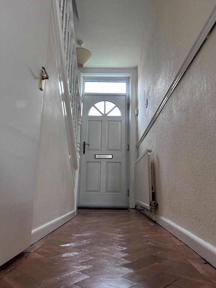Entrance is onto a bright, neutral hallway with stunning parquet flooring.