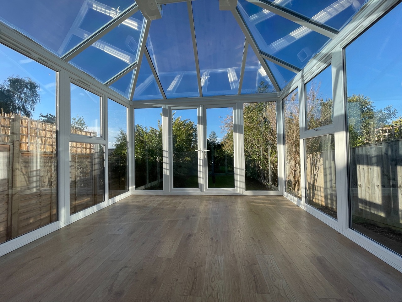 Spacious modern conservatory with special roof coating to prevent overheating in summer.