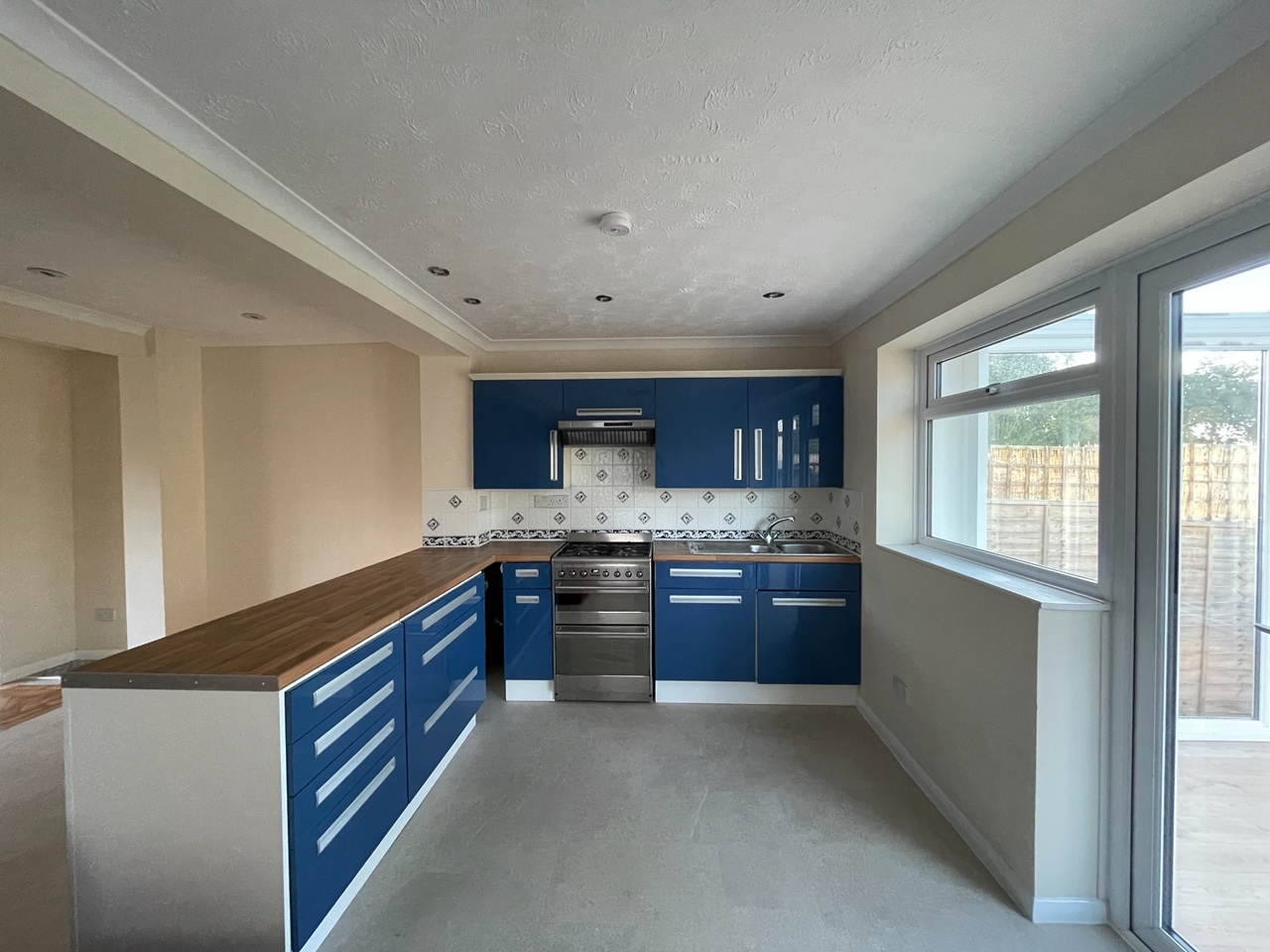 The kitchen is modern with sleek blue units and chrome handles. There is plenty of counter space, a sink, gas oven and electric hob, and space for a fridge/freezer.