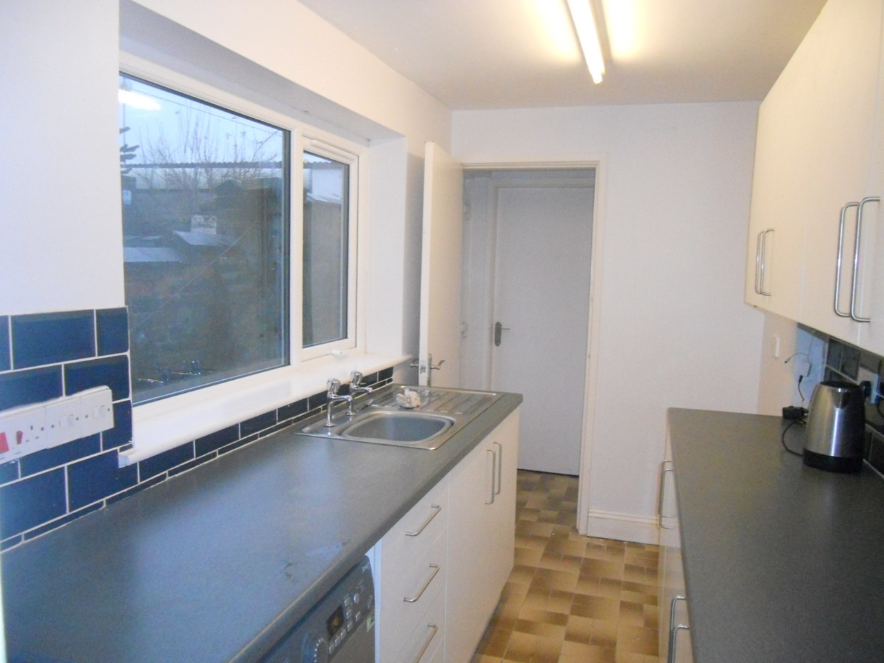 A recently fitted kitchen with electric cooker and space for washing machine, fridge and dryer.