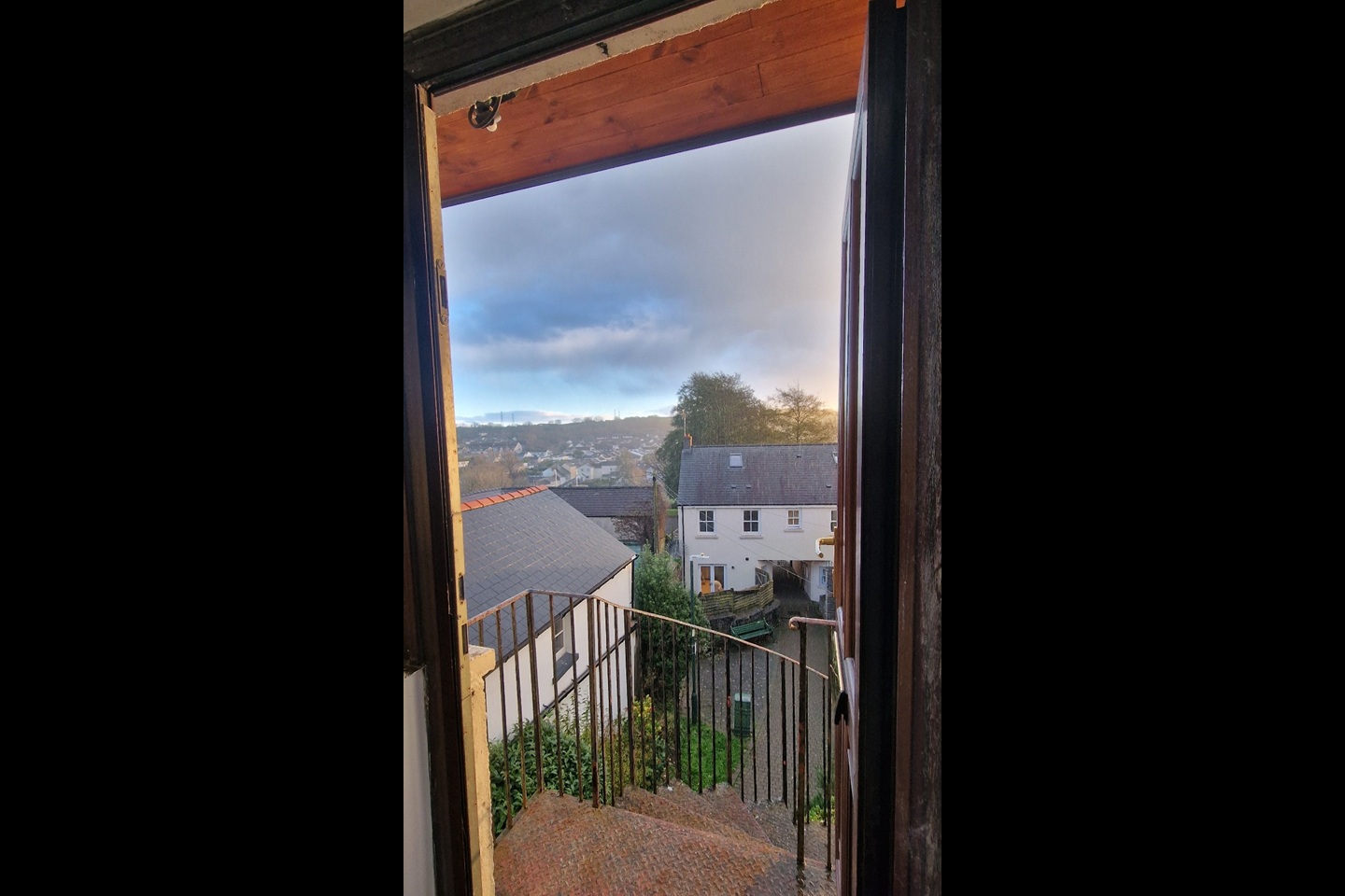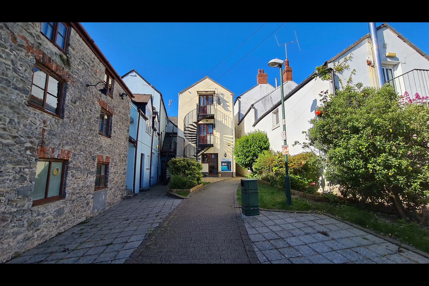 Flat 3 comprises of a bedroom with a window over the passageway and a rear door leading to an exterior staircase, a bathroom with a bath and electric shower is at the centre of the flat, and a Living Room with a kitchen area makes for spacious living accommodation. The front door leads down a spiral staircase to the courtyard, which is accessed by the public during the day but locked in the evening with seating, a small grass area and flower borders.
