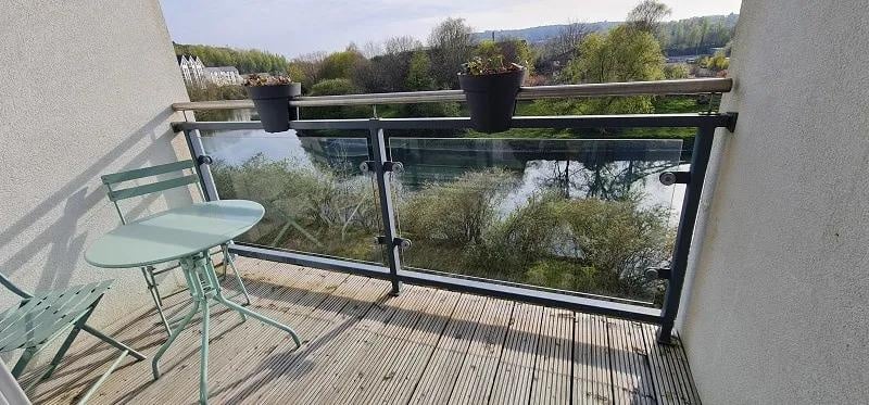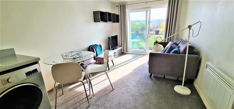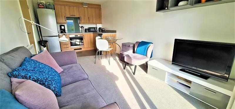 Bright living space which includes; double glazed sliding patio doors to sit out balcony overlooking the River, part laminate flooring, electric radiator, modern kitchen area which includes; range of base and wall units, integrated stainless steel sink unit, integrated electric 4-ring hob and oven with extractor fan over, plumbing for washing machine/dryer, space for fridge freezer.