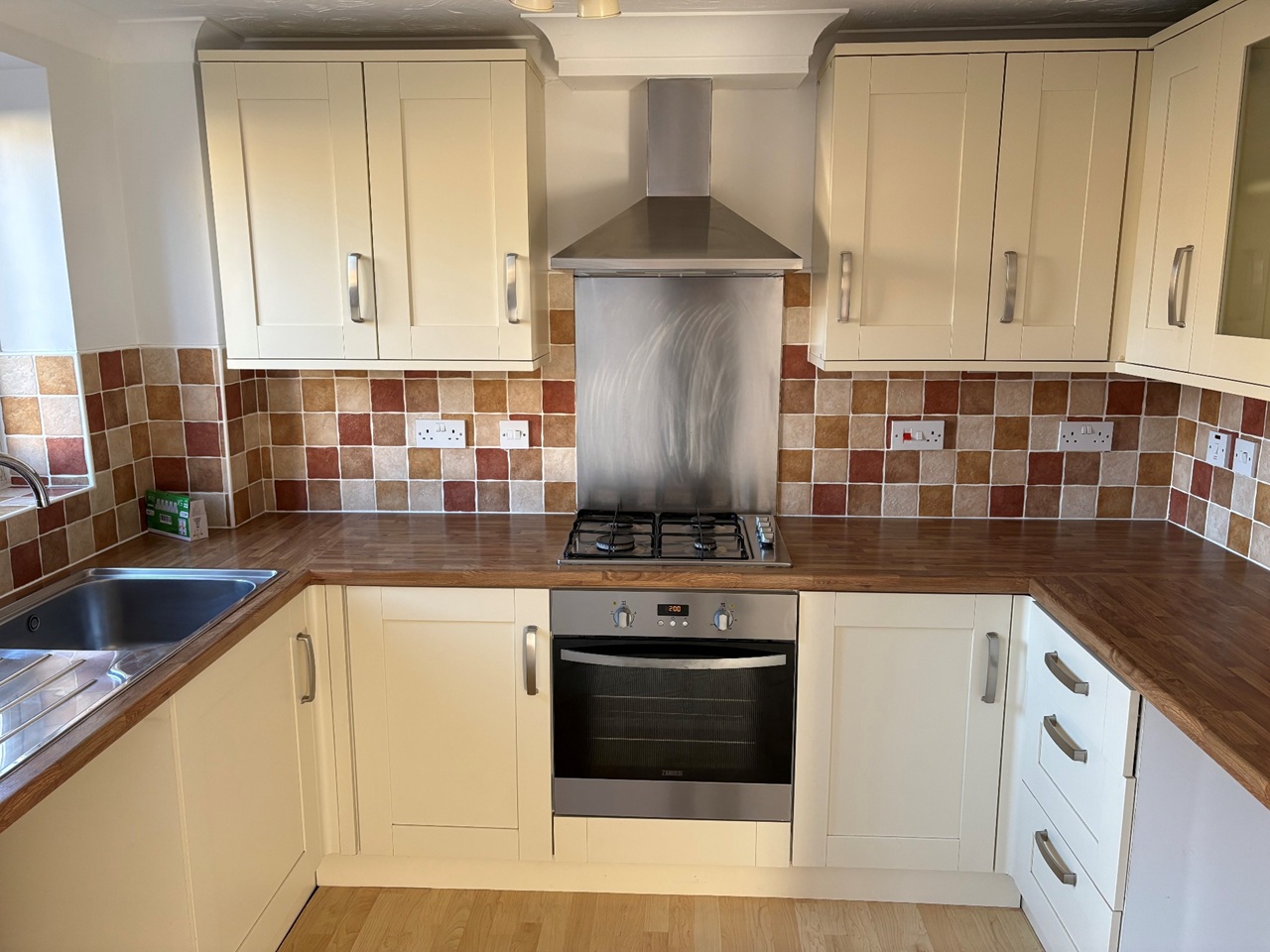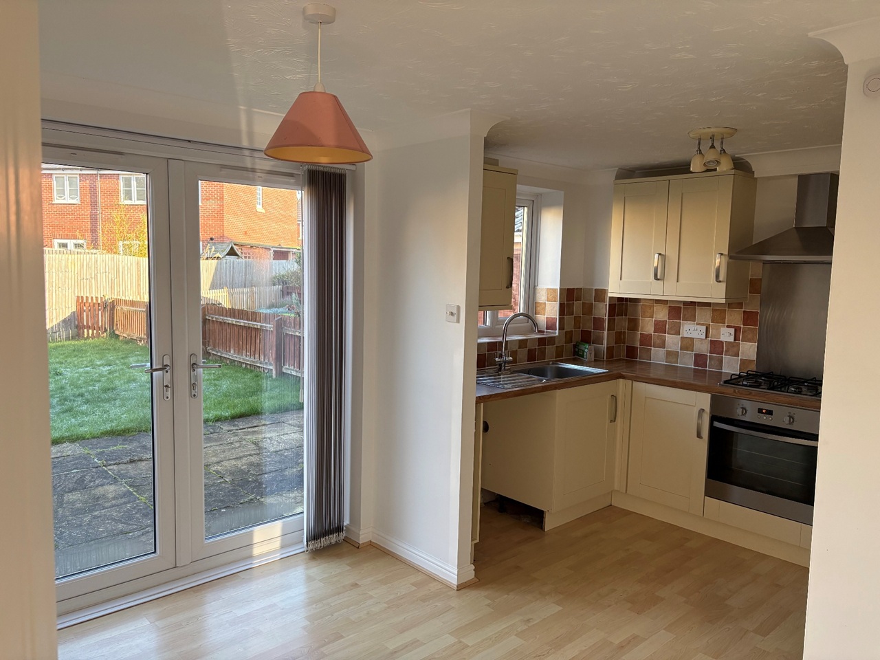 To the back of the property spacious kitchen diner. Laminate flooring. Good selection of fitted wall and base units. Gas hob, electric oven and extractor fan. Plumbing for washing machine. Space for condenser tumble dryer.