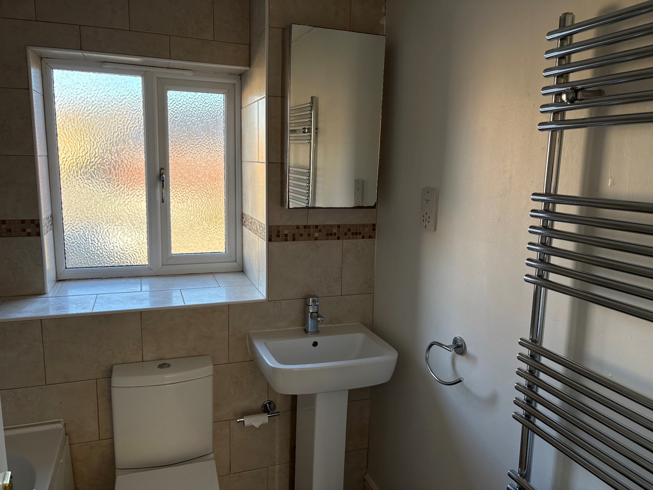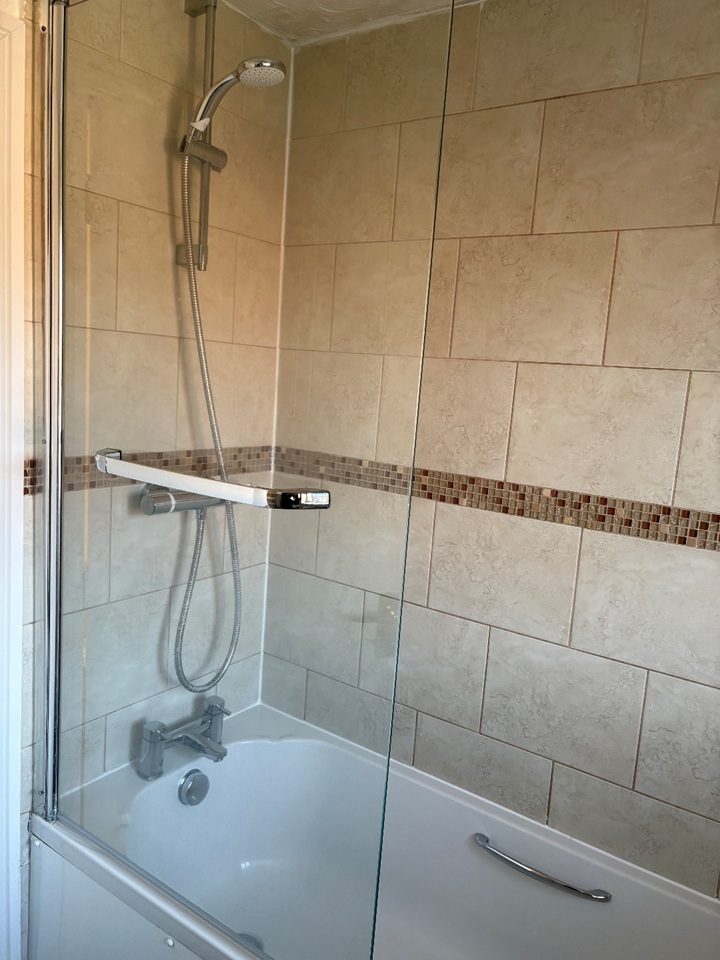 Family bathroom, 3-piece white suite, with power shower over bath