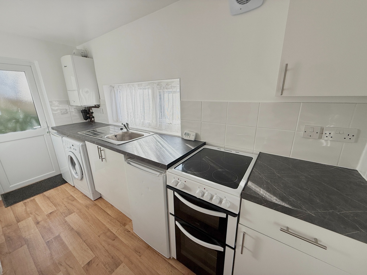 Kitchen with white goods including a cooker, washer dryer, fridge and freezer.