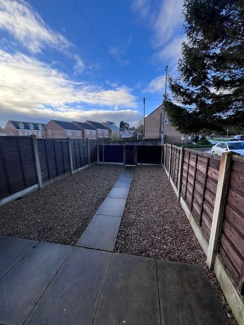 Paved patio and pebbled garden with secure fencing surround, parking to the front.