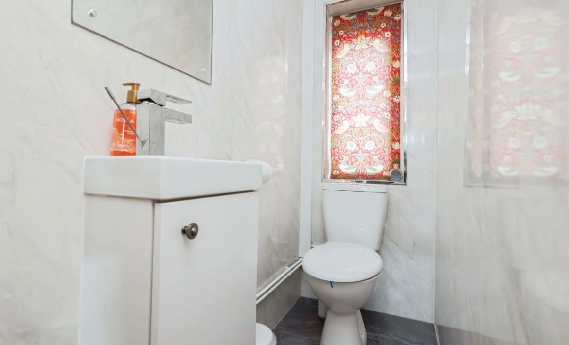 The ground floor comprises a welcoming entrance hallway, a light-filled front lounge, a separate dining room, and a spacious kitchen with a breakfast bar. A guest cloakroom/downstairs WC adds further convenience, with under-stairs storage.