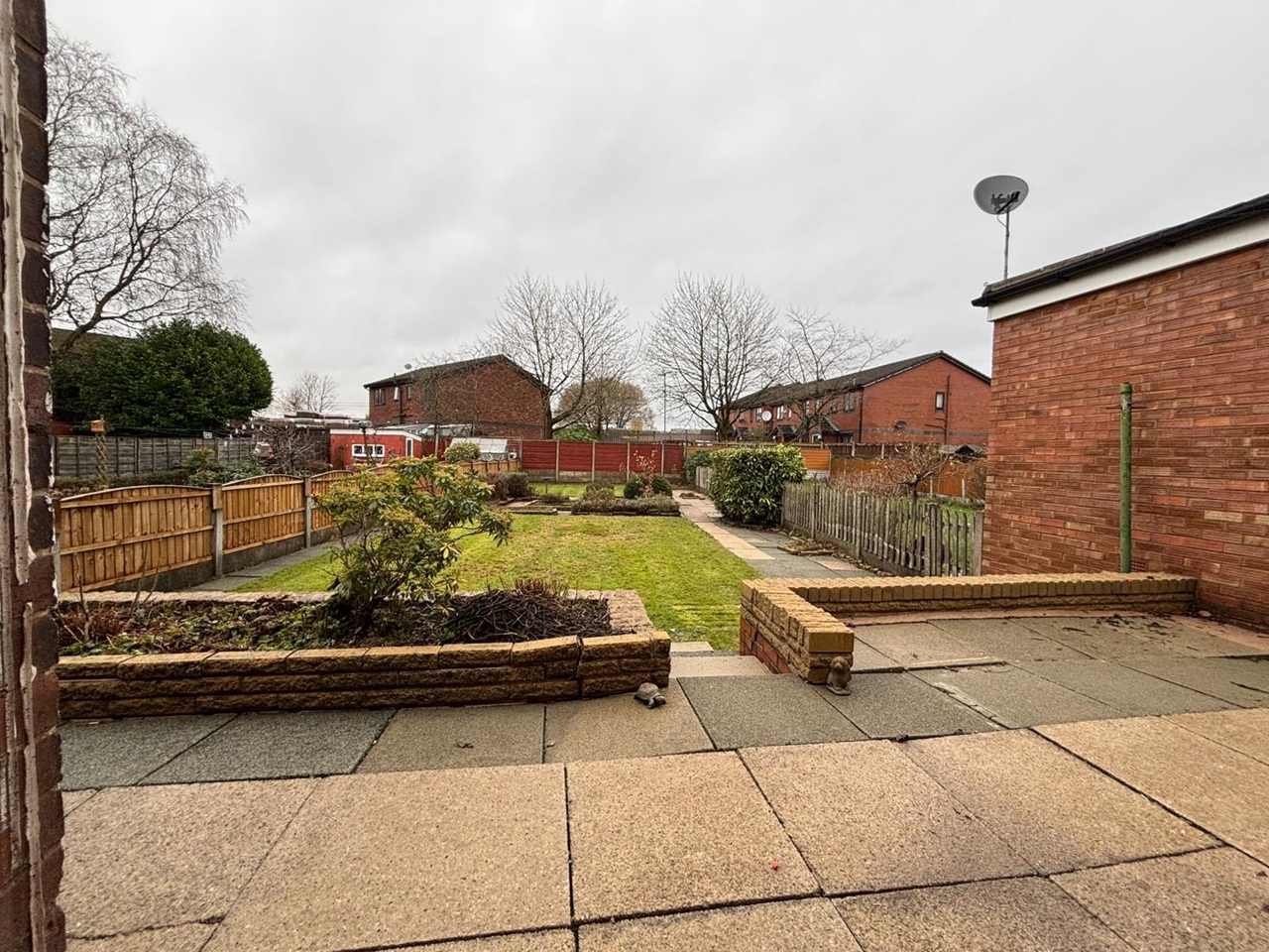 Huge rear garden with patio, pathways, lawn areas and landscaped beds – perfect for families
