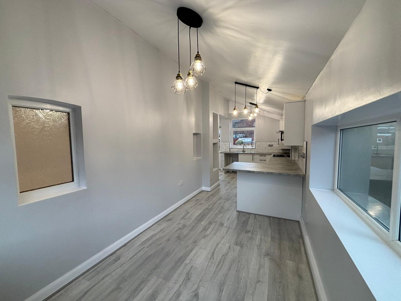 Impressive open kitchen/dining area with feature lighting, breakfast bar, integrated oven/hob, and rear garden views