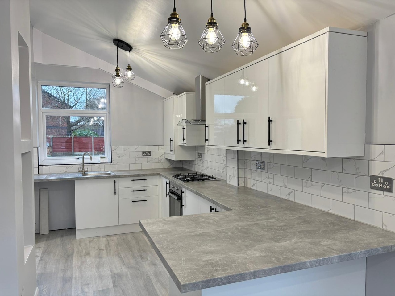 Spacious modern kitchen with breakfast bar, glossy white units, subway tiles, and feature lighting