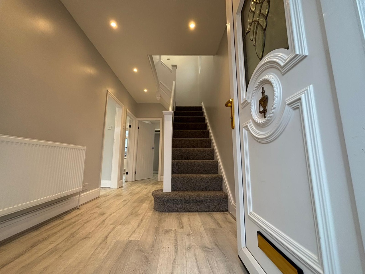 Lovely entrance hallway with spotlights and newly carpeted staircase
