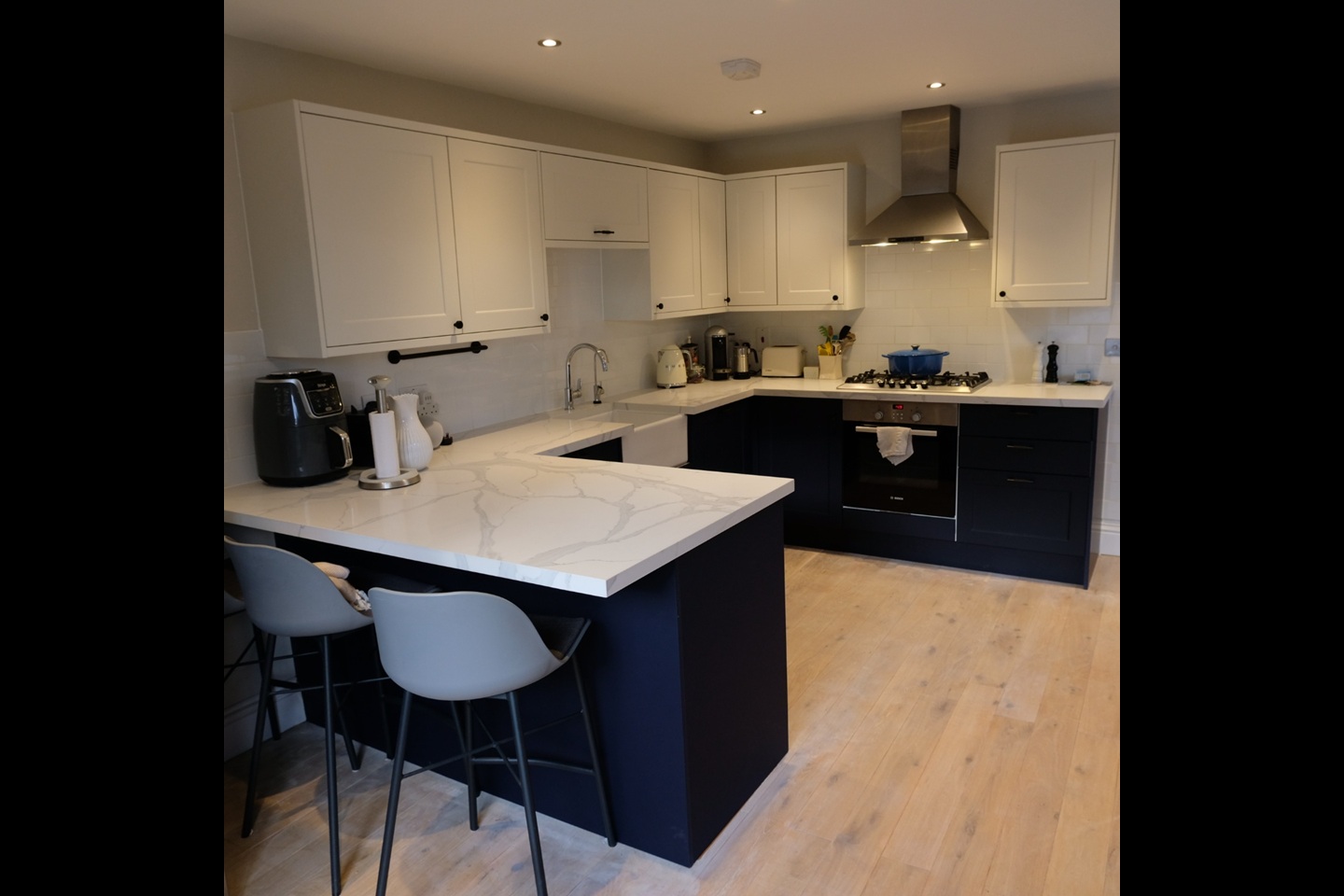 As evident from the photoraphs it has been decorated to a high standard. There is a modern kitchen with quartz worktops and high end appliances.