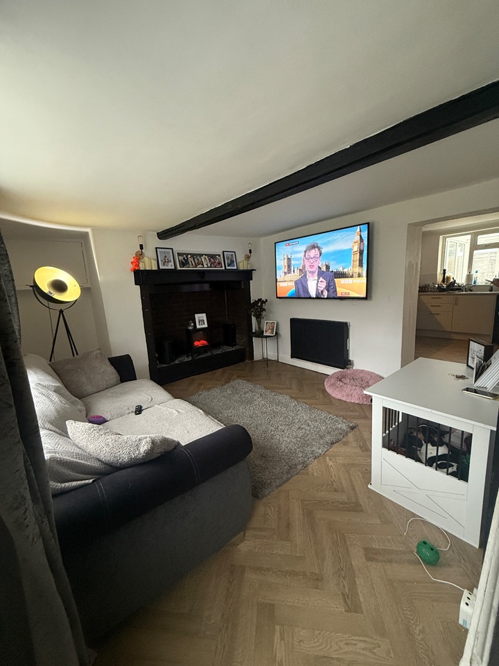 Inside, the cottage feels warm and inviting, with a comfortable living room centered around an open fireplace that adds character, though it is not currently in use. The kitchen embraces classic cottage style, with AGA cooker then leading out to a small rear garden.