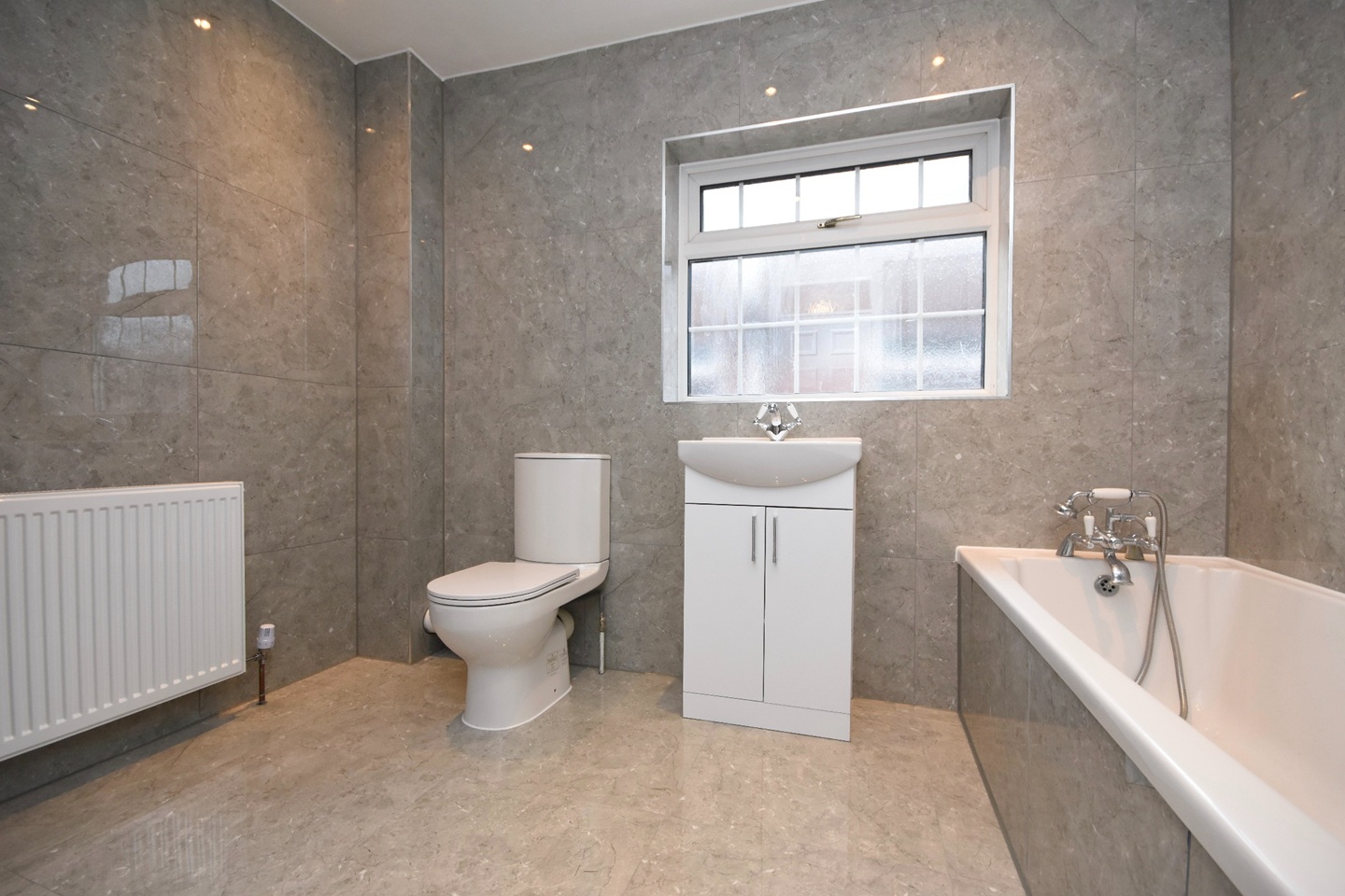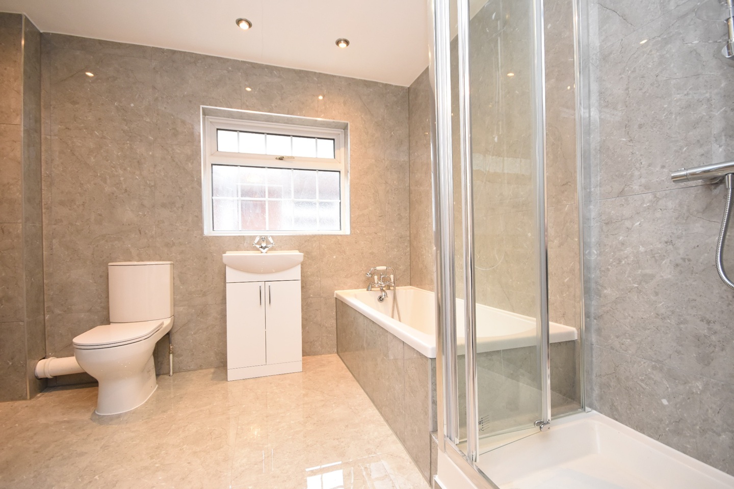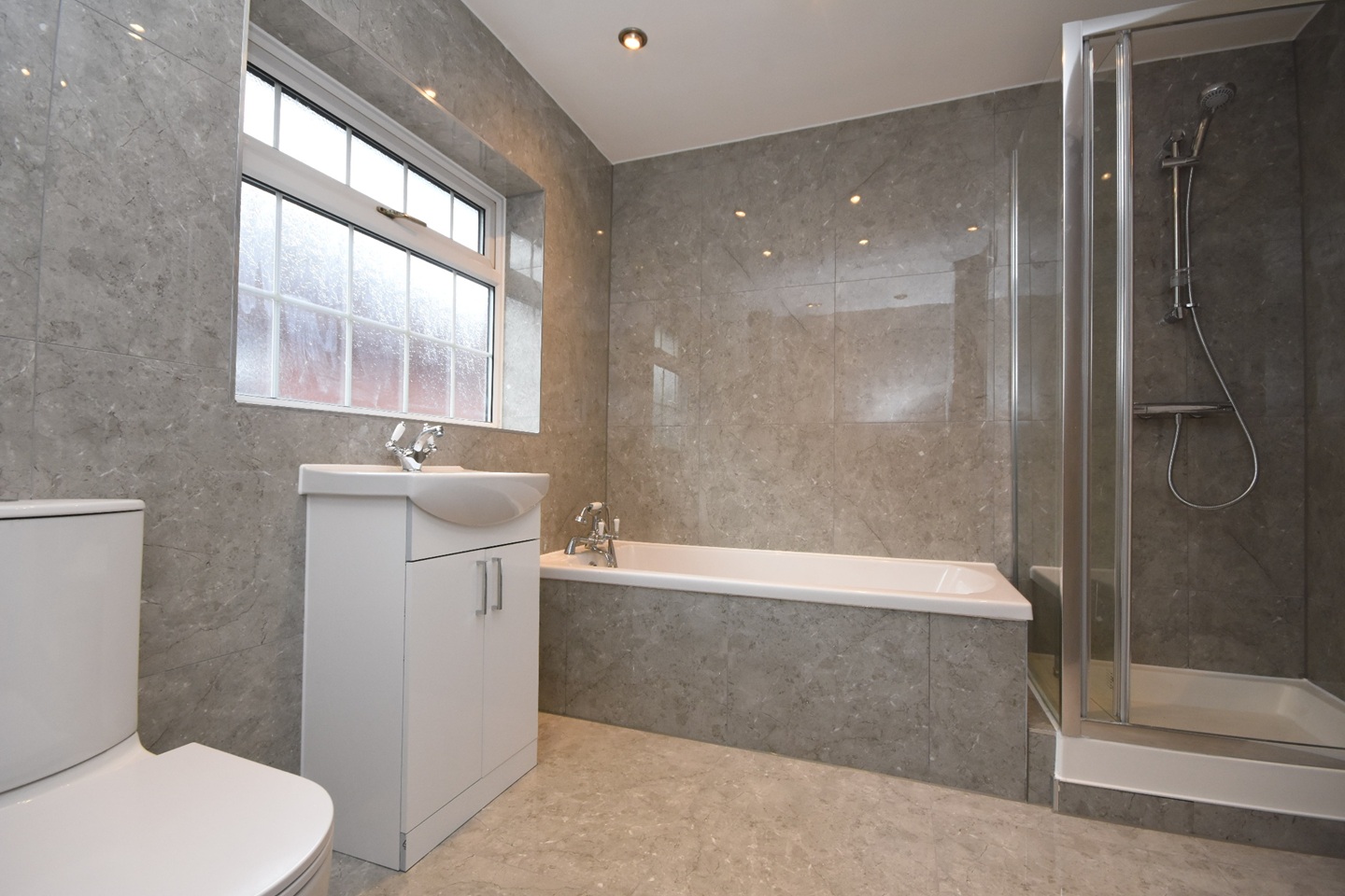 Obscure double glazed window to the side of the property,quality low level WC, contemporary style vanity sink unit with mixer taps, quality tiled bath panel design incorporating large bath, separate power shower area, polished porcelain tiled flooring and walls, radiator heating.