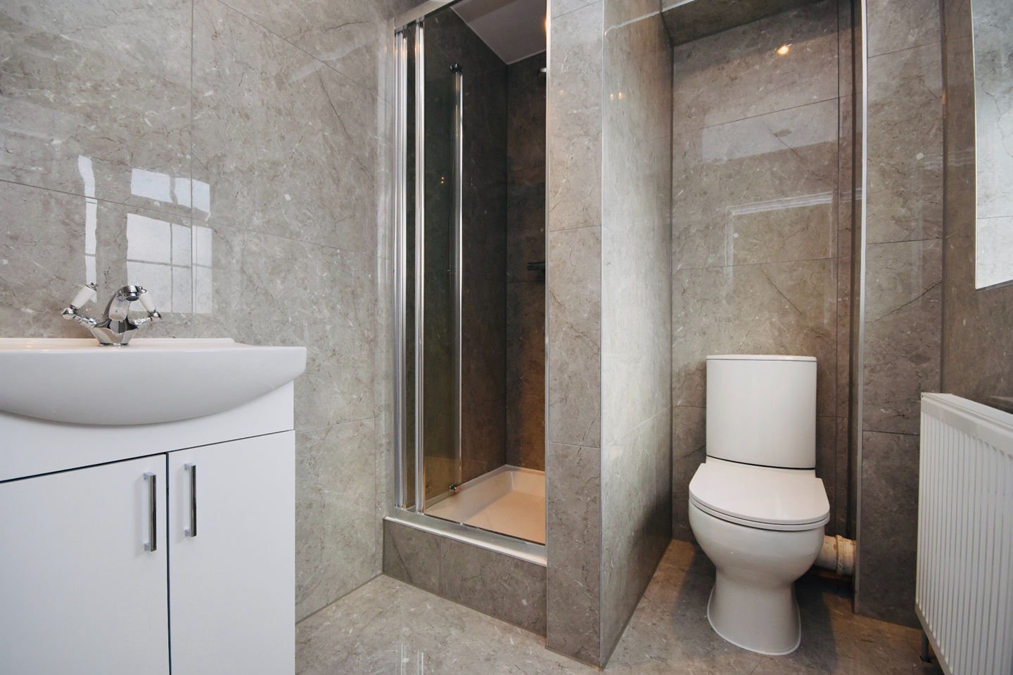 Double glazed window looking out to the front of the property, quality low level WC, contemporary style vanity sink unit with mixer tap, power shower,, polished porcelain quality tiled flooring and walls, radiator heating.