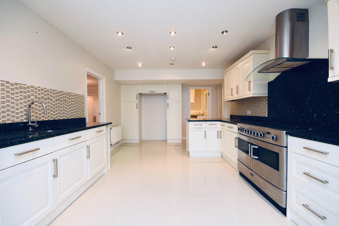 A quality range of contemporary style eye and base level units with polished granite worktops incorporating a breakfast bar, stainless steel bowl and drainer with mixer tap, integrated dishwasher, large space for an American style fridge freezer, polished porcelain quality tiled flooring, various mains power points and radiator heating.