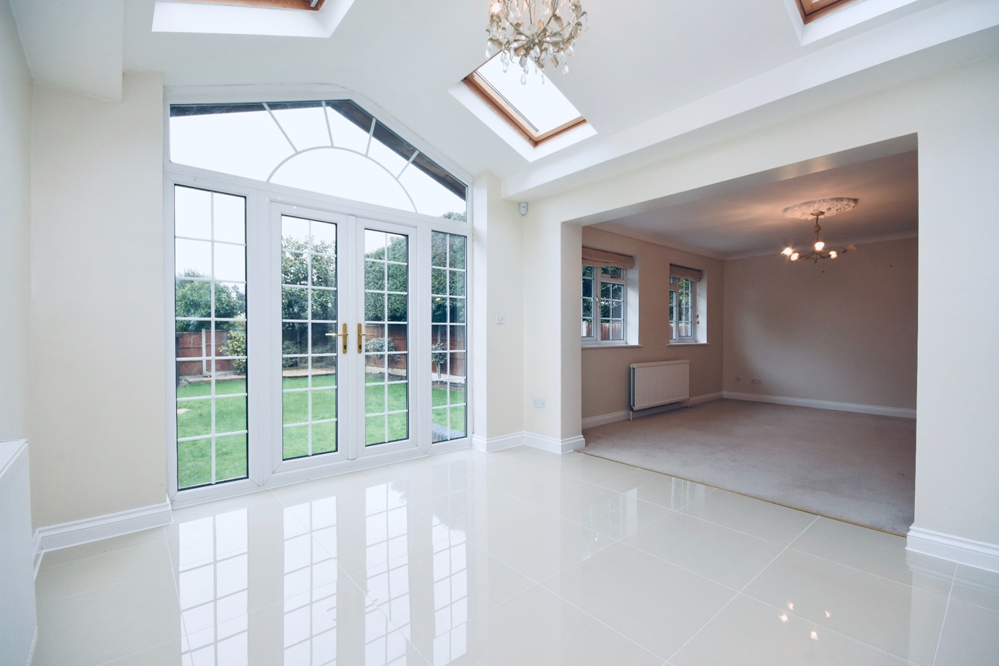 Double glazed French style patio door set with featured sun style window above looking out to the rear garden,, four double glazed Velux skylight windows,