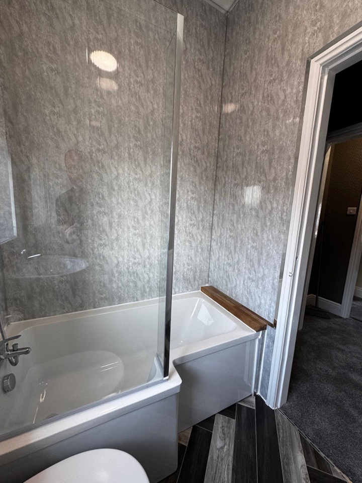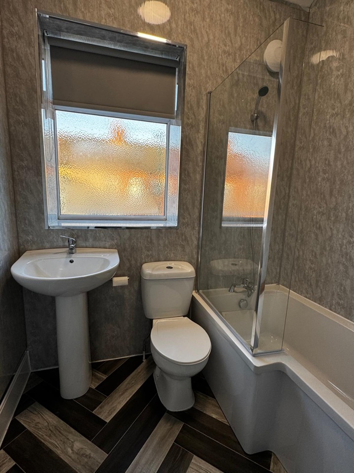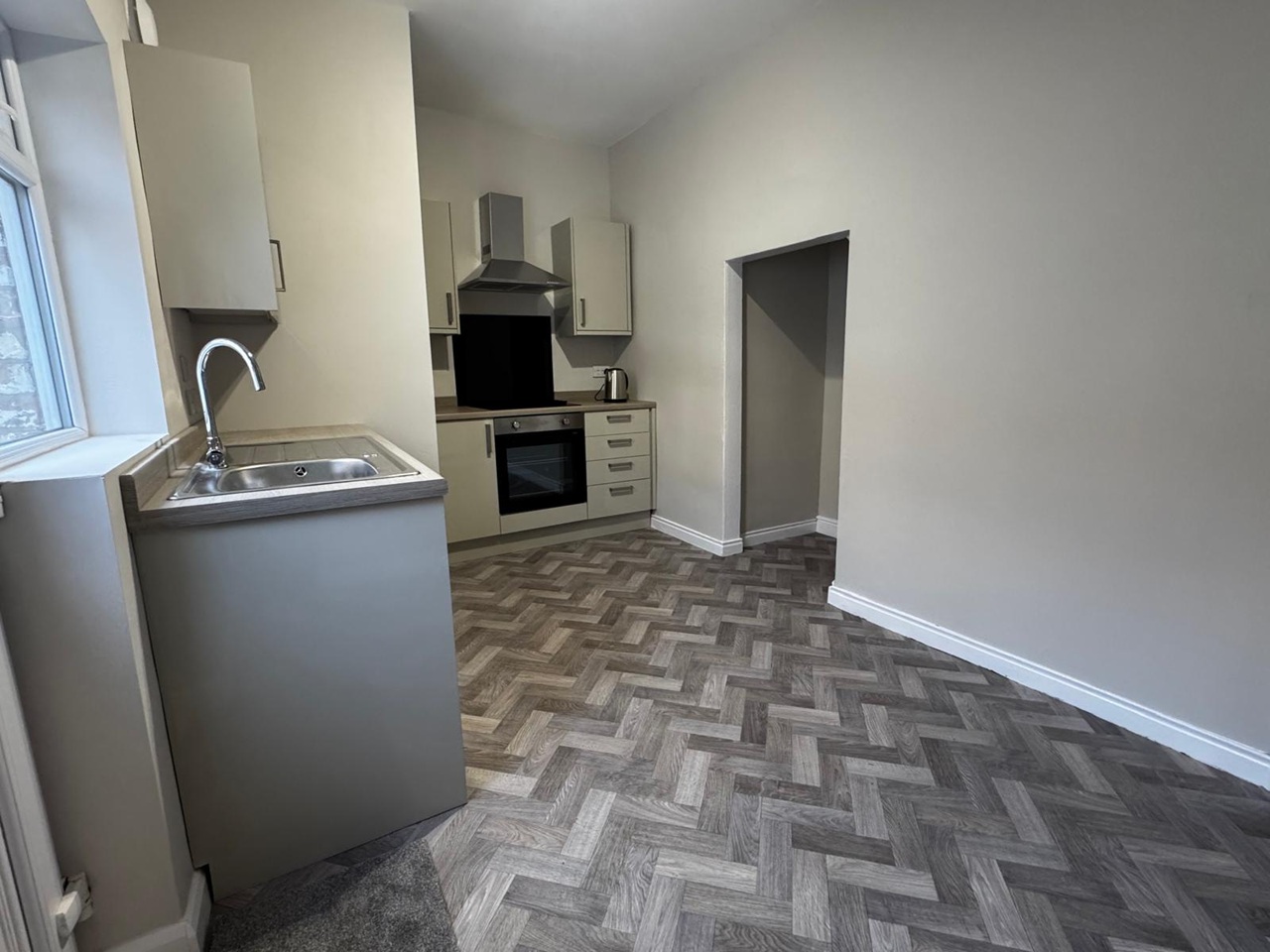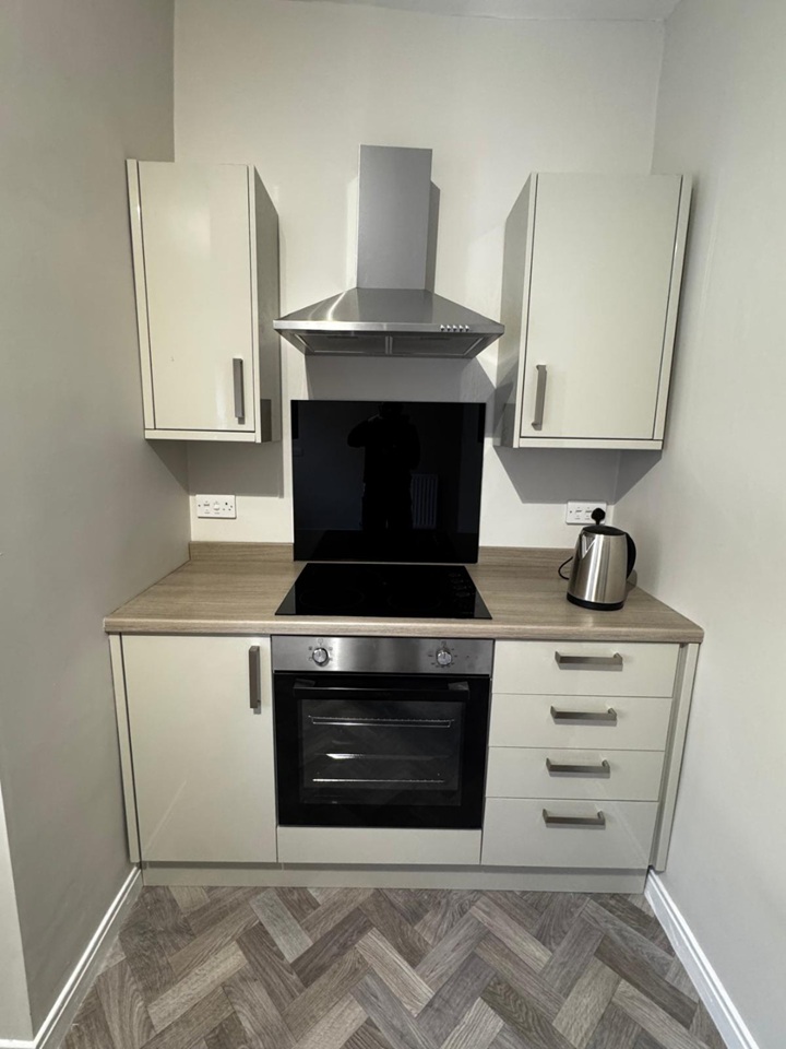 The property features a bright and spacious living area with a bay window, a modern fitted kitchen with integrated oven and extractor, and a contemporary bathroom suite with shower over bath. The neutral colour scheme and modern flooring throughout create a clean, stylish finish.