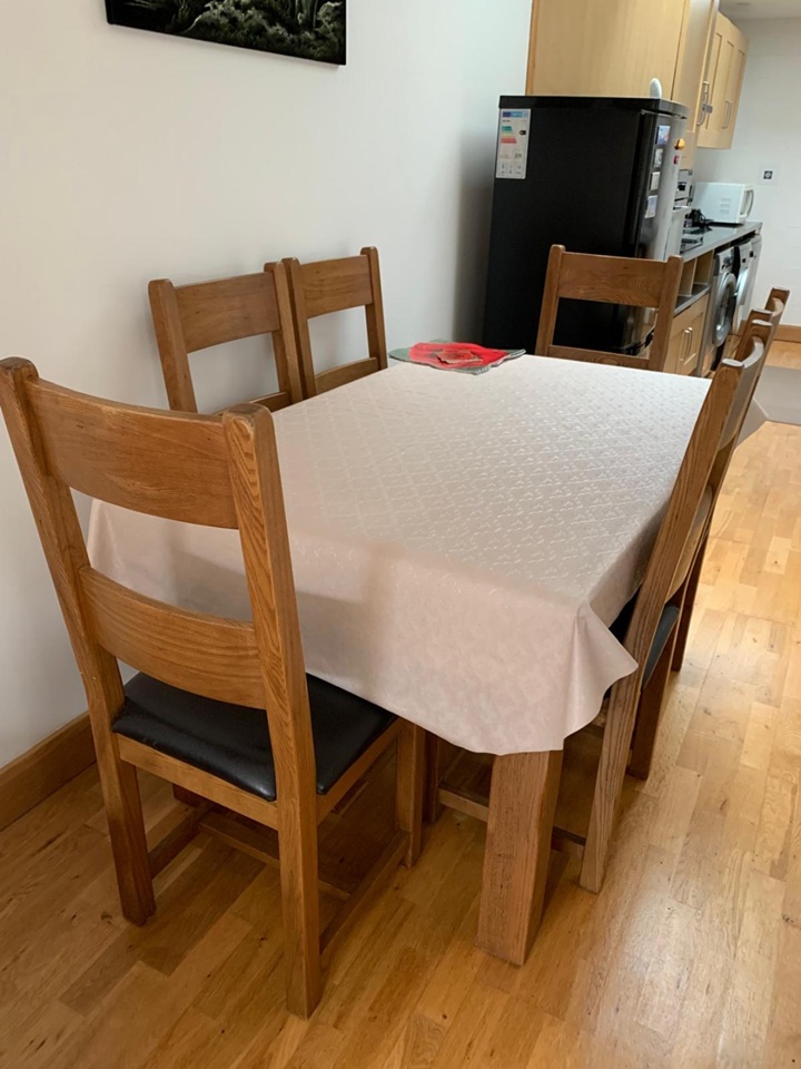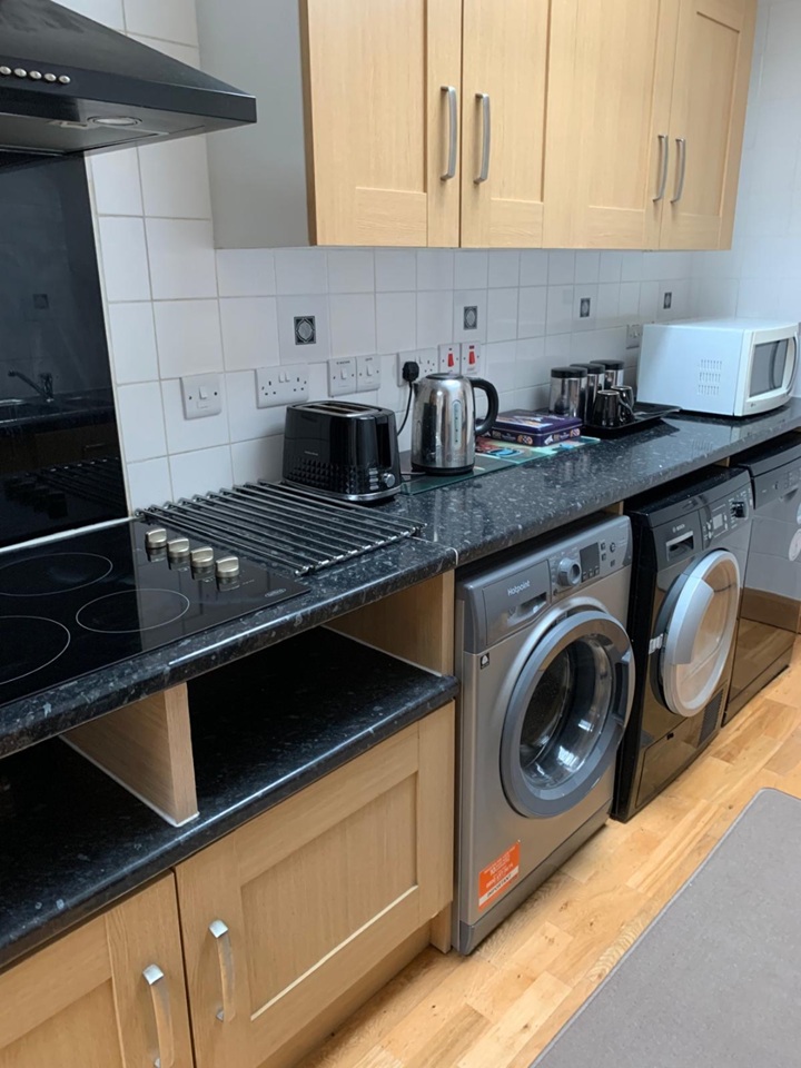 Property has open plan kitchen, dinning room and lounge. Kitchen has electric stove, washing machine, tumble dryer, fridge freezer, and dishwasher.