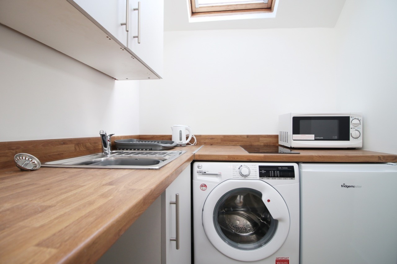 ✅ Kitchenette with electric hob, under-counter fridge freezer, washer dryer, microwave, and kettle