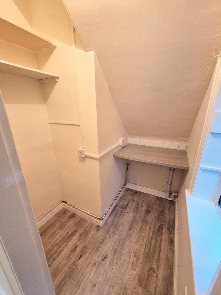 Kitchen Diner & Utility: Fitted with base and eye-level units, laminate worktops, a sink with drainer, oven and hob with extractor, plus space and plumbing for a washing machine. Includes a storage cupboard and access to the garden. Neutral décor and laminate flooring throughout.