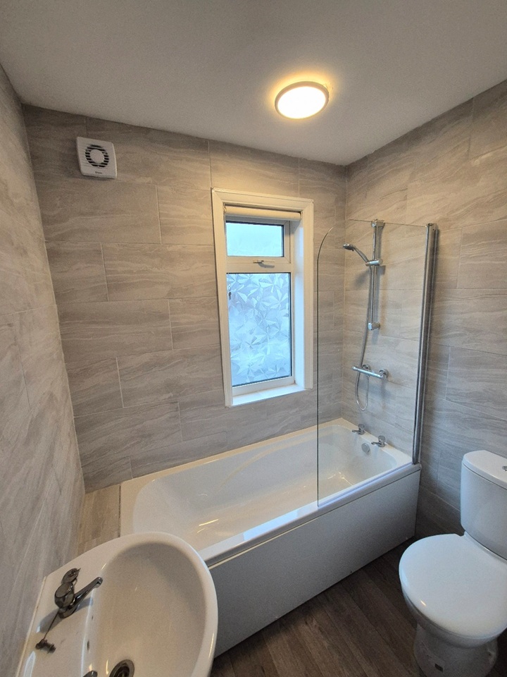 Bathroom: Modern bathroom comprising a vanity sink, standard bath with overhead rain shower, and silver-style fittings. Neutral décor and flooring throughout.