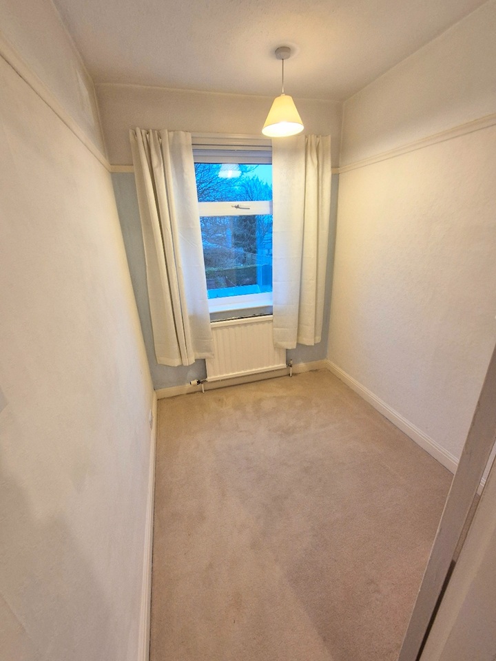 Bedroom Three: Single bedroom with neutral décor and carpet flooring.