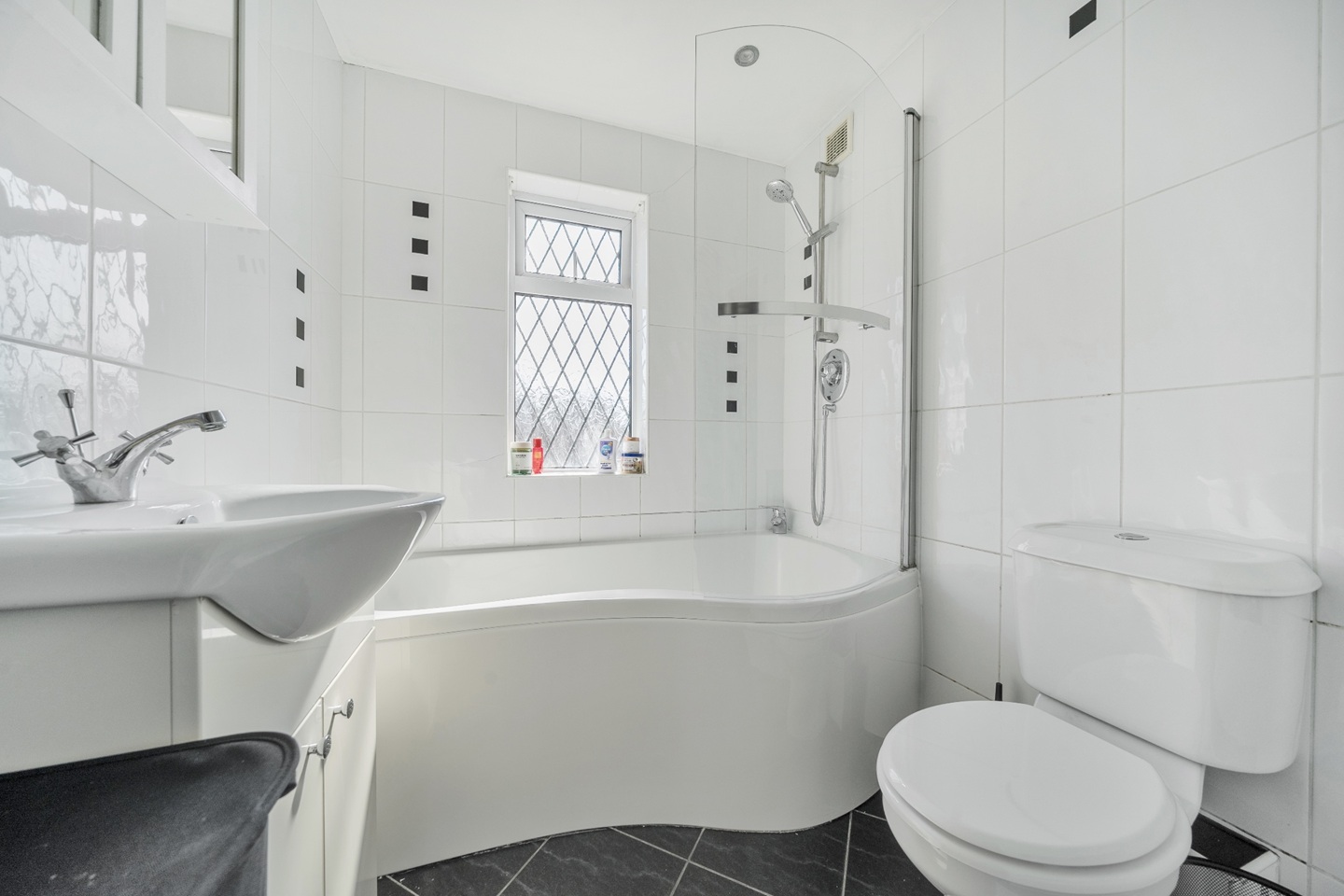 - Modern Family Bathroom: A stylish three-piece suite featuring a P-shaped bath with overhead shower, sleek tiles, and modern fittings.