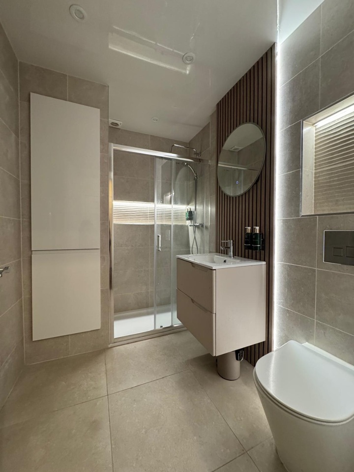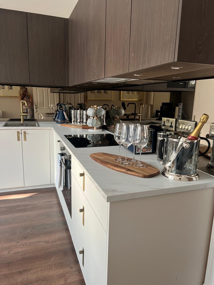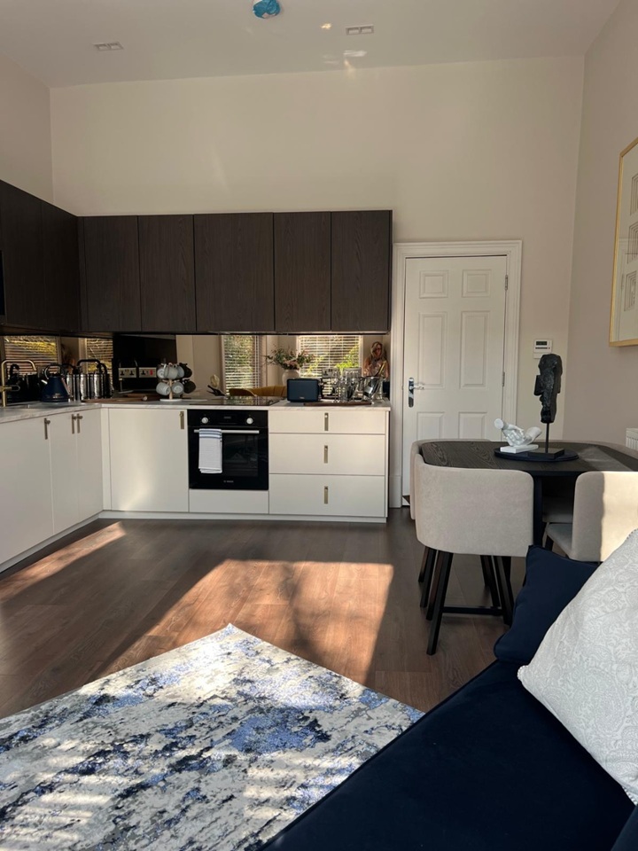 Finished to a high specification throughout, the apartment features an impressive open-plan kitchen and living area, a large contemporary bathroom with a shower, and two double bedrooms — finished with stylish modern décor throughout.