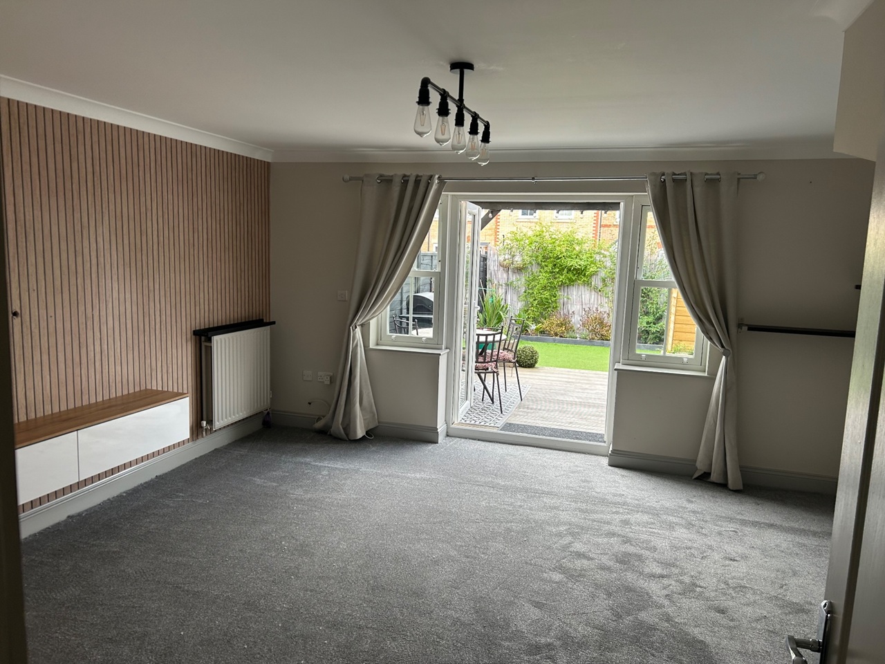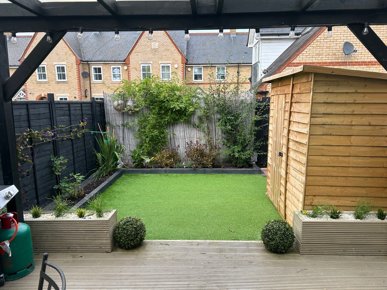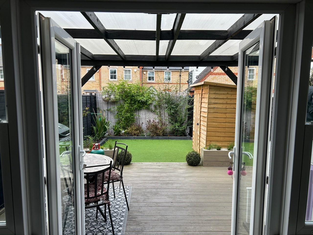 Outside is a large undercover decked area, perfect for entertaining stepping down onto artificial lawn.