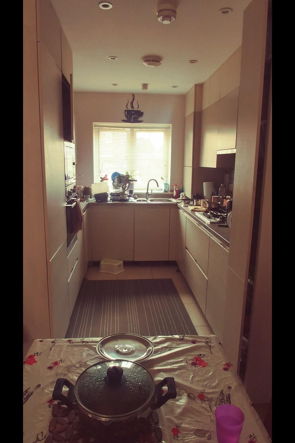 An open plan lovely modern stylish 9’8” X 8’0” kitchen with integrated fridge-freezer, oven, microwave, dishwasher, washing machine, and plenty of storage cupboards.